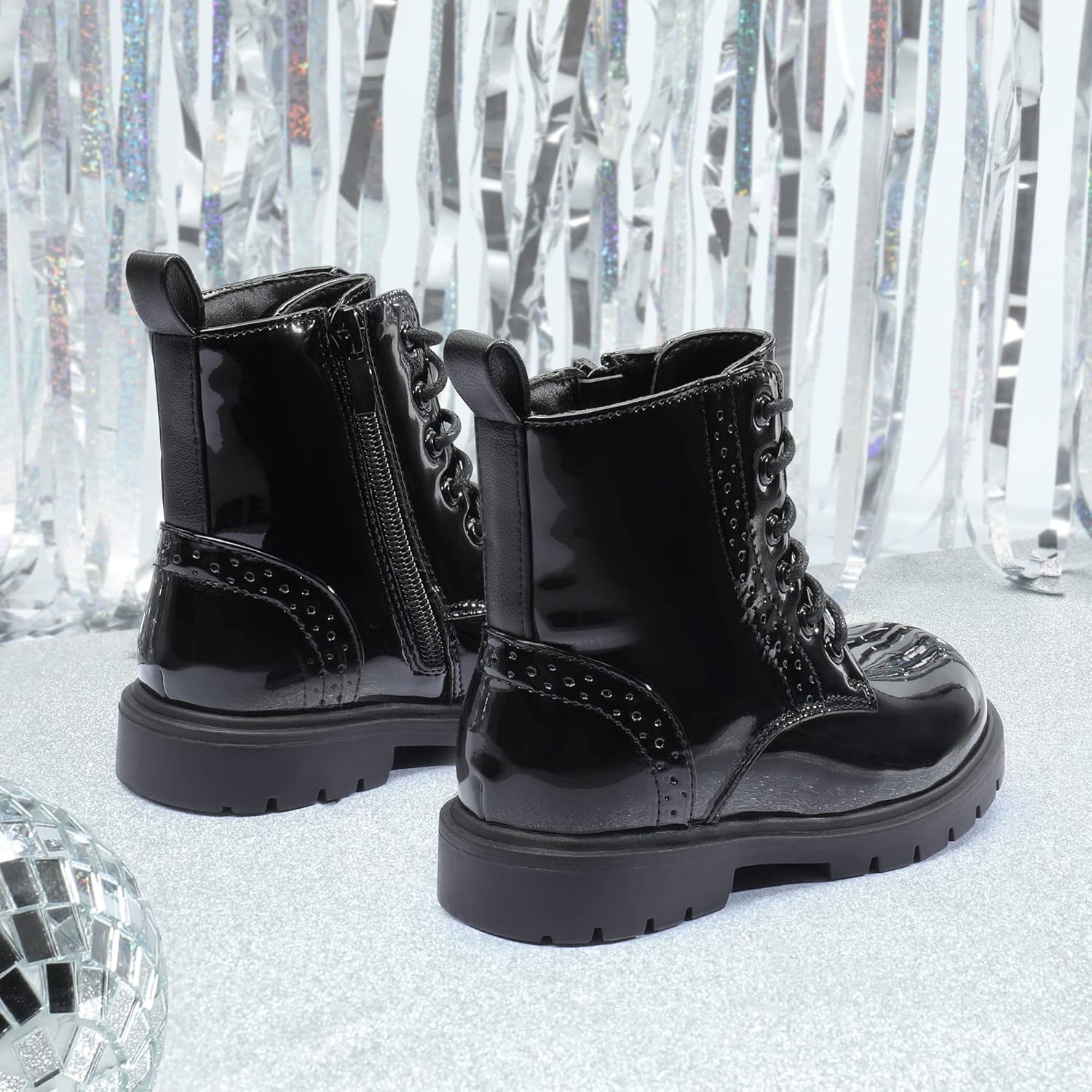 DREAM PAIRS Kids Girls Black Patent Zip Lace Up School Ankle Boots