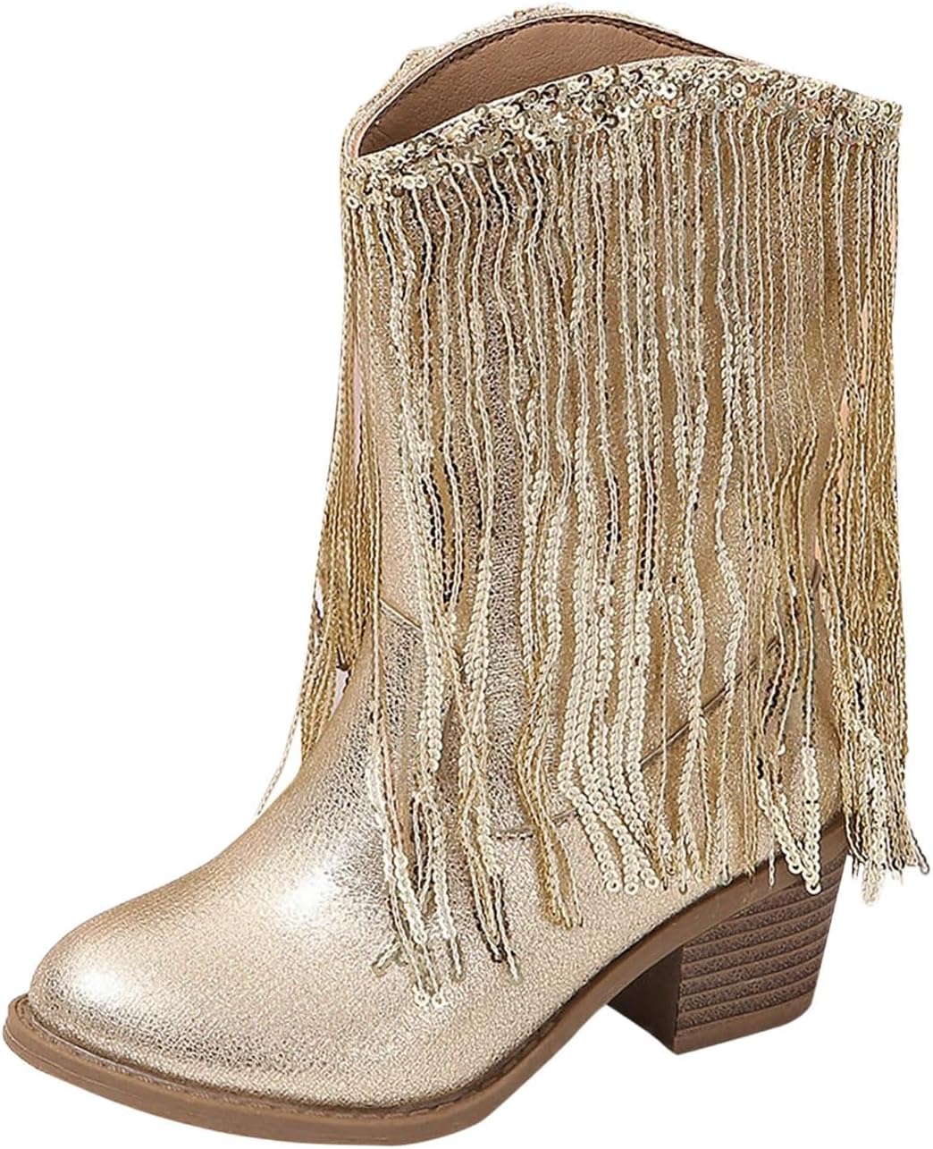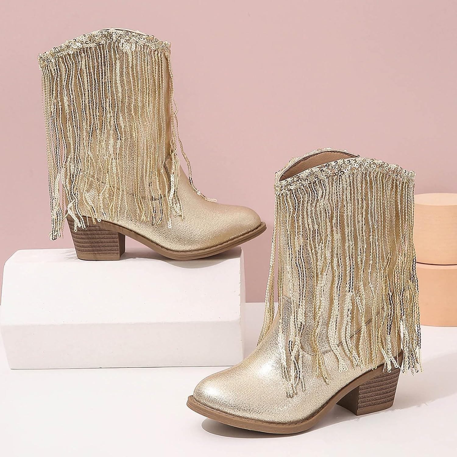 Kids Winter Boots Girls Ankle Boots Gold Sequins Tassel Leather Cowboy Boots Thick Heels Boots for Girls Mid Calf Riding Shoes