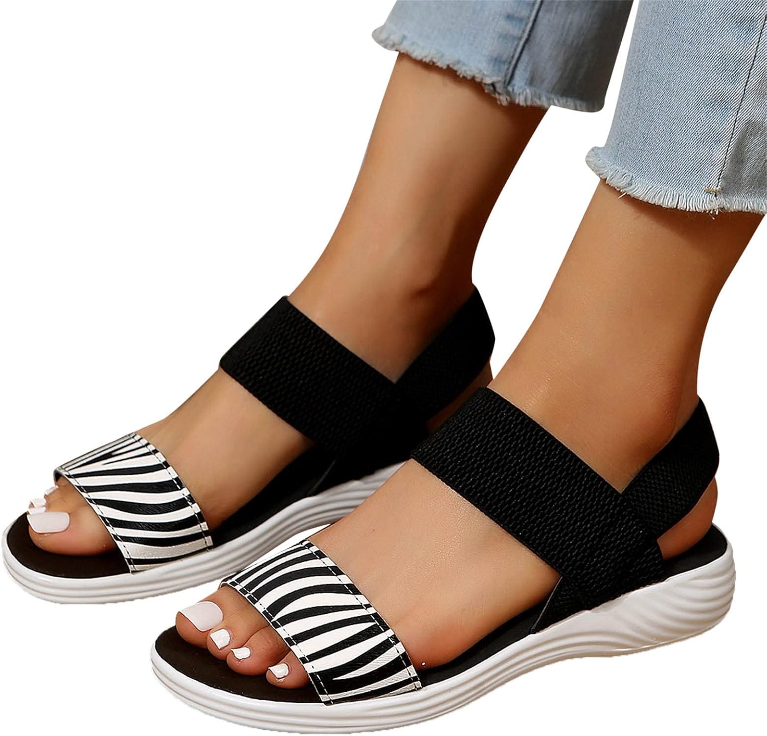 LZPCarra Women’s Open Toe Flat Sandals Slippers Ladies Dressy Flat Wide Fashion Stripe Colored Round Toe Slip-On Shoes New Girls Personalized Design Wedges Thick Sole Comfortable Non Slip Sandal