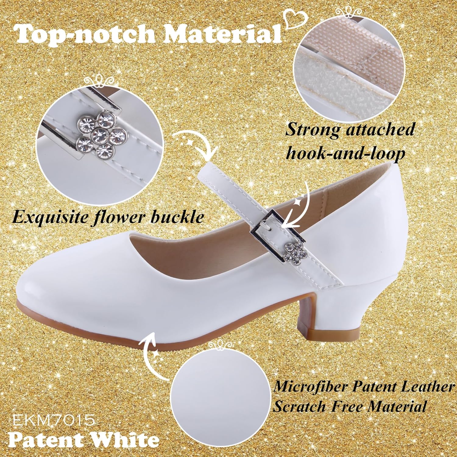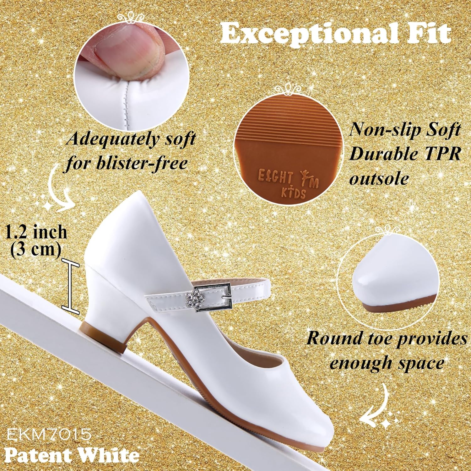 Customers find the shoes attractive with a shiny glitter design and a dainty heel. They fit well and are of good quality.