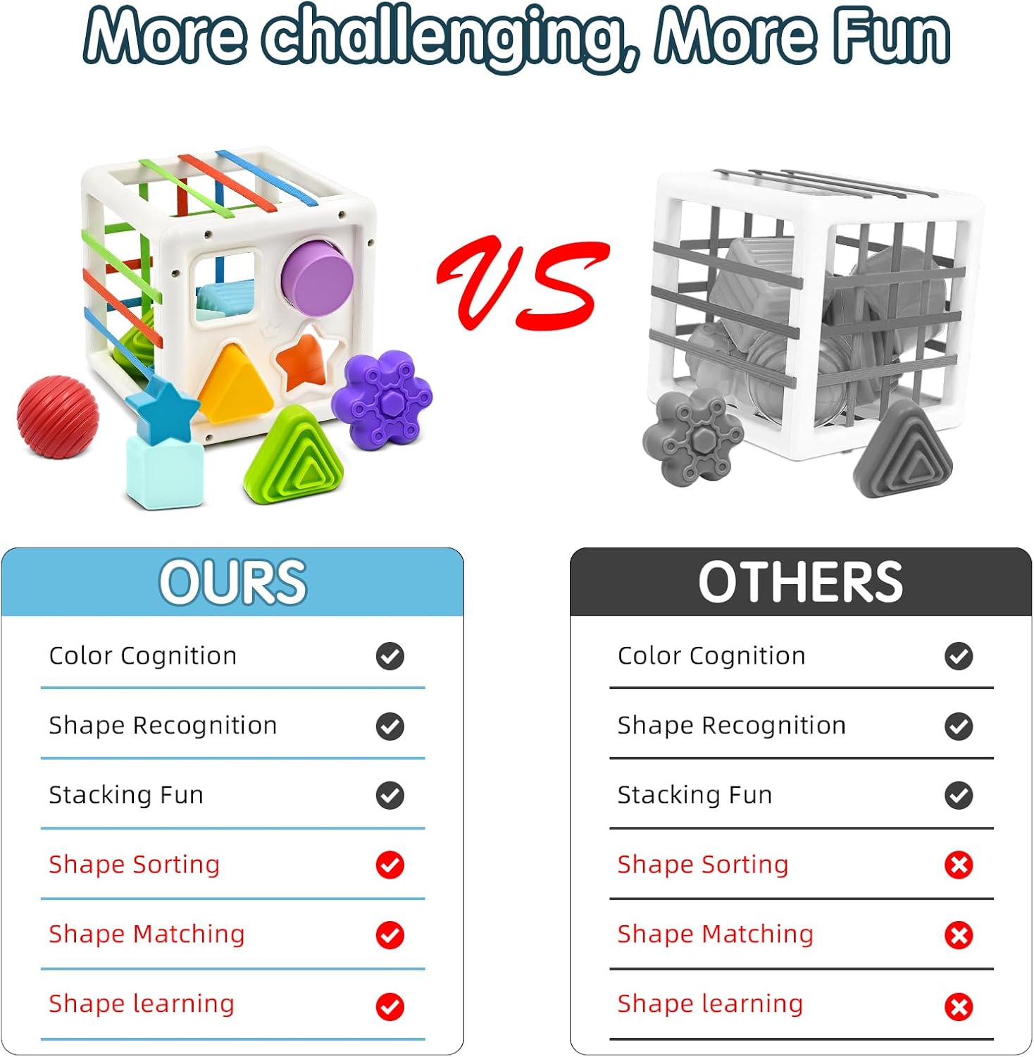 【3 Different Levels Challenge】Our baby sensory bin is rectangle, 5 sides with elastic bands covered in soft fabric, another side is shape sorting board, 9 months plus babies can start and learn to get blocks through the single row side, then grow with challenging that multi rows side, growing 18 months can challenge shape sorting successfully, so this is definitely a growing toy with 9 12 months infants and will last.