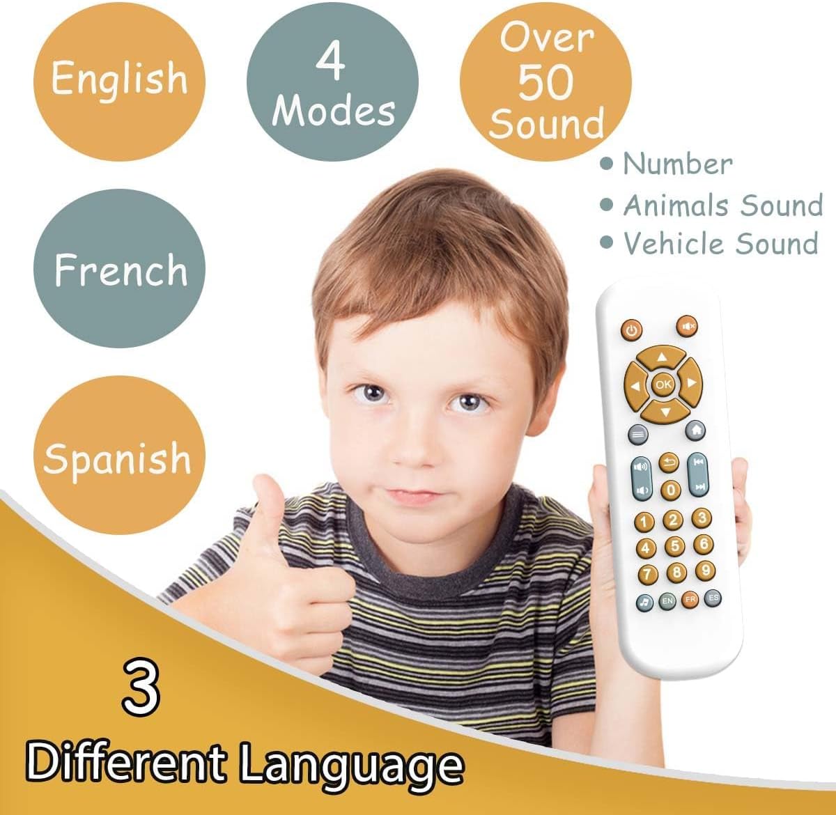【Musical and Multi-Language TV Remote Control】The TV remote control can easy switch 3 languages:English, French and Spanish, baby can learn number 0-9 in different languages while playing, which helps improve baby’s cognition of numbers and language learning ability. Keep baby entertain for hours and promote their independent play with the buttons.