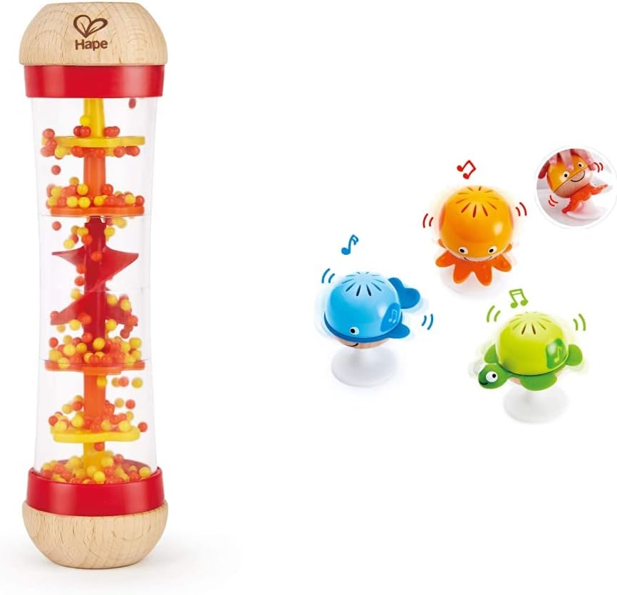 Hape Beaded Raindrops | Mini Wooden Musical Shake & Rattle Rainmaker Toy, Red & Rattle Set, “Stay-Put” 3 Sea Creatures With Individual Sounds, Teether Details and Suction Pads. 0+ months