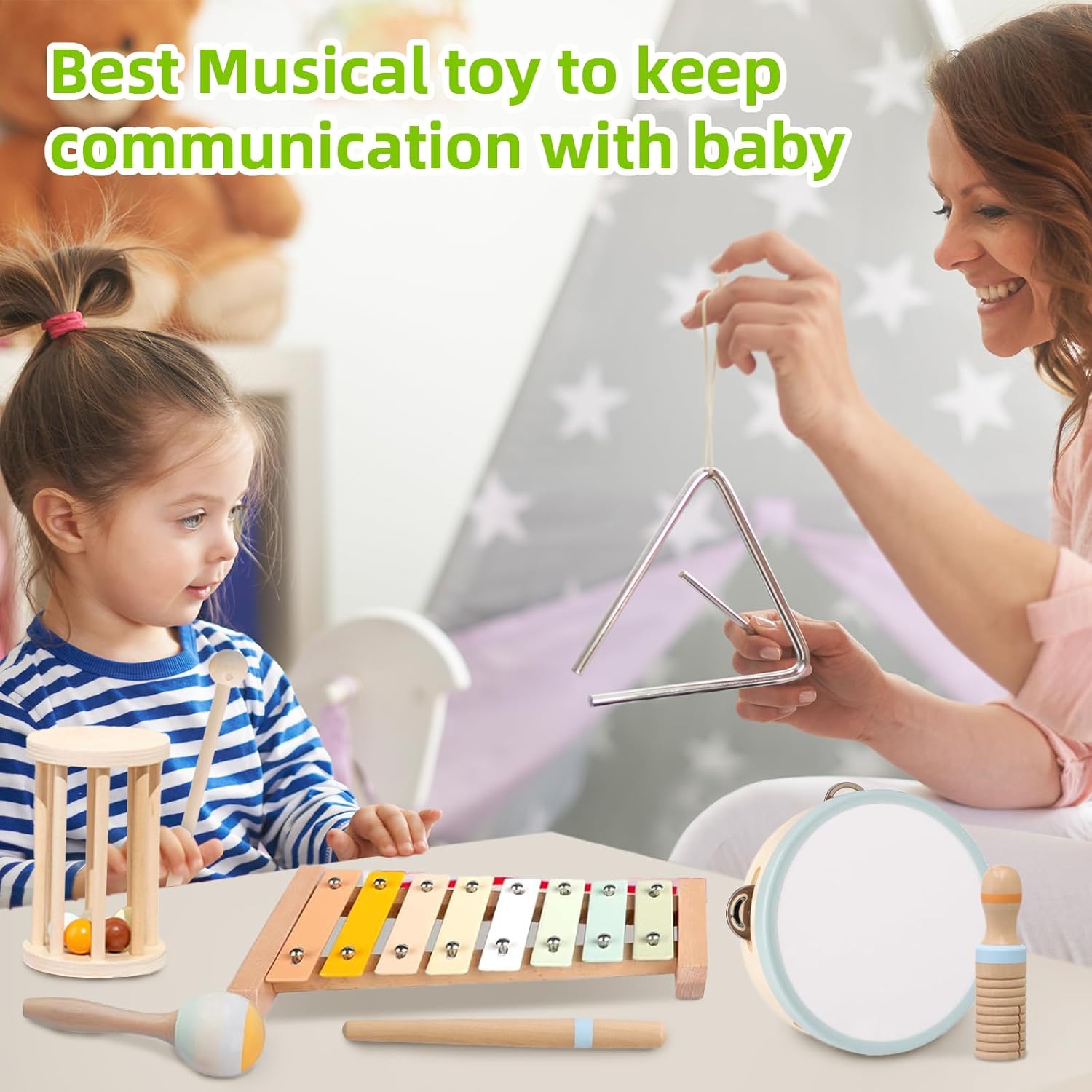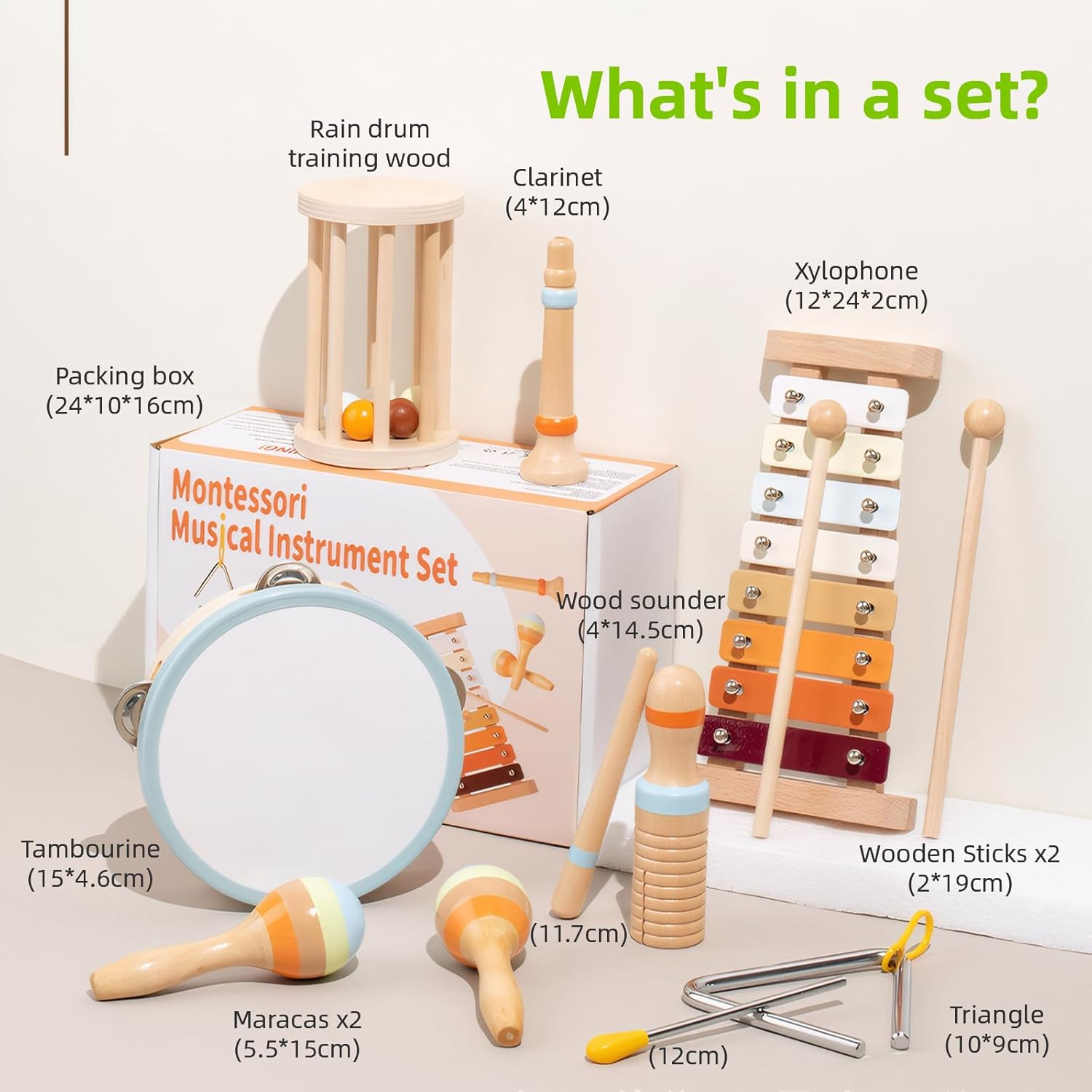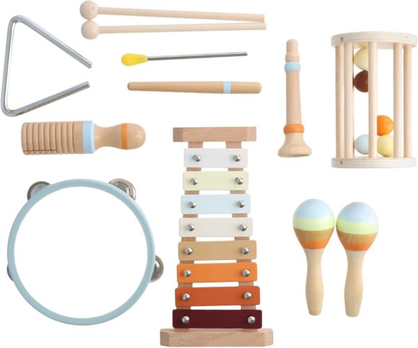 Comprehensive Set: This wooden percussion instrument set including Xylophone, Tambourine, Triangle with striker, Wood Sounder, Maracas, Clarinet. Cute, designed with neutral colors set of musical instruments toys expose mini-musician to different tones, volume and rhythm, which is attractive to kids.