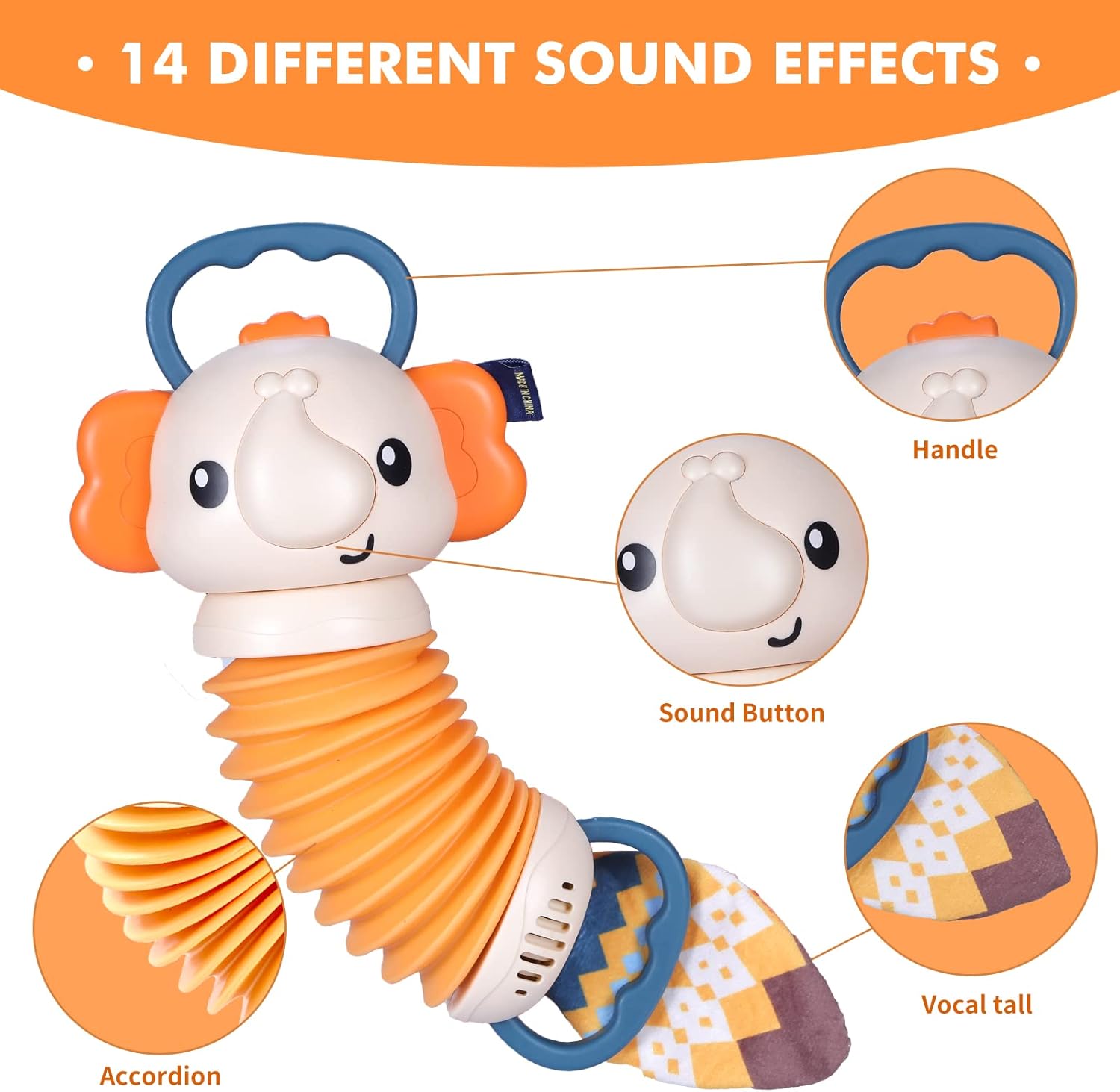 🐘【Baby SENSORY DEVELOPMENT】Elephant accordion Toy has 14 sweet voice, and the sound is changed through the buttons on the nose and tap the Dog’s body and it makes fun little sound effects too.Designed with easy-to-grab handles, it’s perfect for little hands, can attract the baby’s attention, stimulate the child’s imagination, one of the best baby sensory toys, preschool toys helpful for early education .