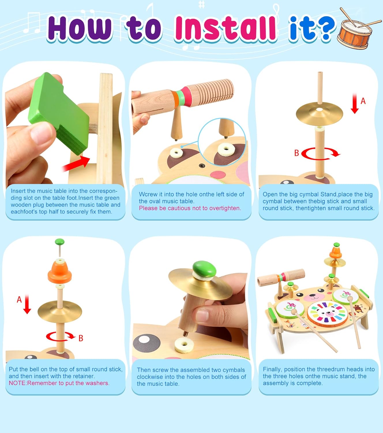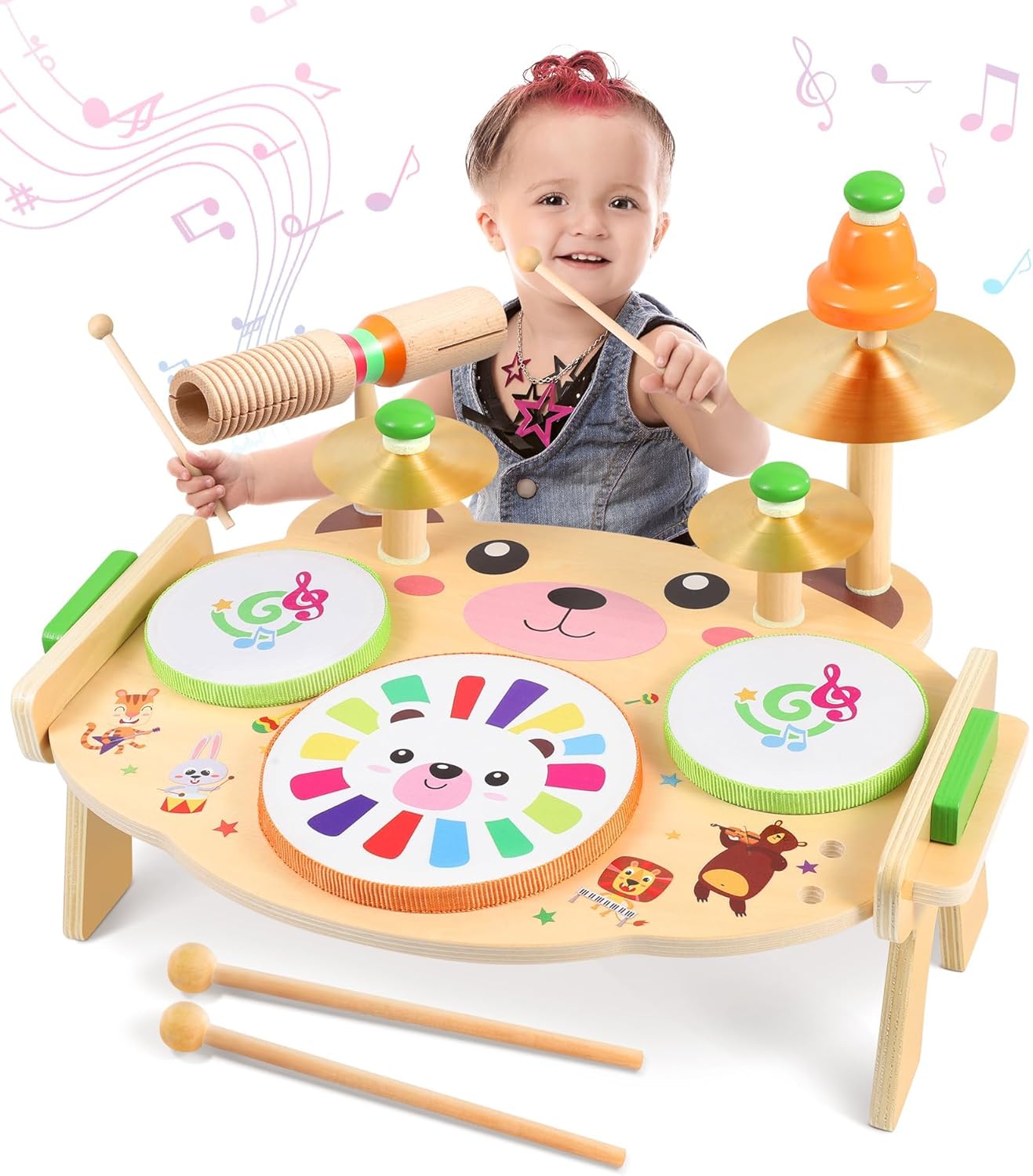 【Music toy for ages 1, 2, 3 years and up】This children drum kit allows children to explore simple musical concepts through creative play. Improve baby hand eye coordination and develop fine motor skills, auditory sensitivity with drums, cymbals and more. Help your child develop a sense of rhythm and melody with this wooden toy.