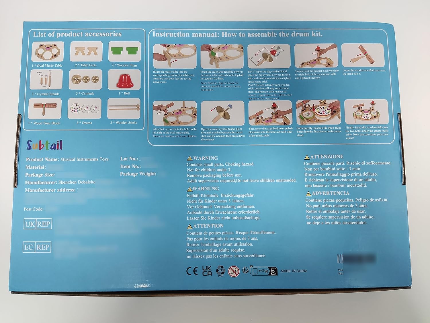 【10 in 1 musical instruments for children】 The Subtail drum kit for children has a design patent. The Subtail drum kit for children is a fully functional drum kit for children with 3 drums, 1 bell, 3 cymbals, 1 wooden tone block and 2 wooden sticks. Snap on design, no external tools required, easy installation in a few minutes. Wooden sticks can be plugged directly into the table.