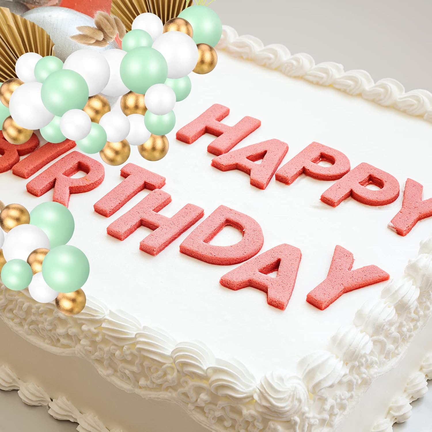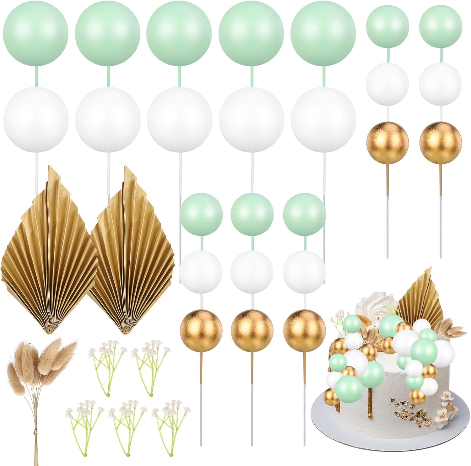 Value Combination — The flower cake toppers include 2 x paper palm fan, 5 x rabbit tail grasses, 5 x aux flowers, 10 x 1.2in cake balls decorations with 2 different colors(pink, white), 5 x 1.0in gold balls decorations, 8 x 0.7in cake balls decorations with 2 different colors(pink, white). enough styles, and quantities for your cake decorating needs.
