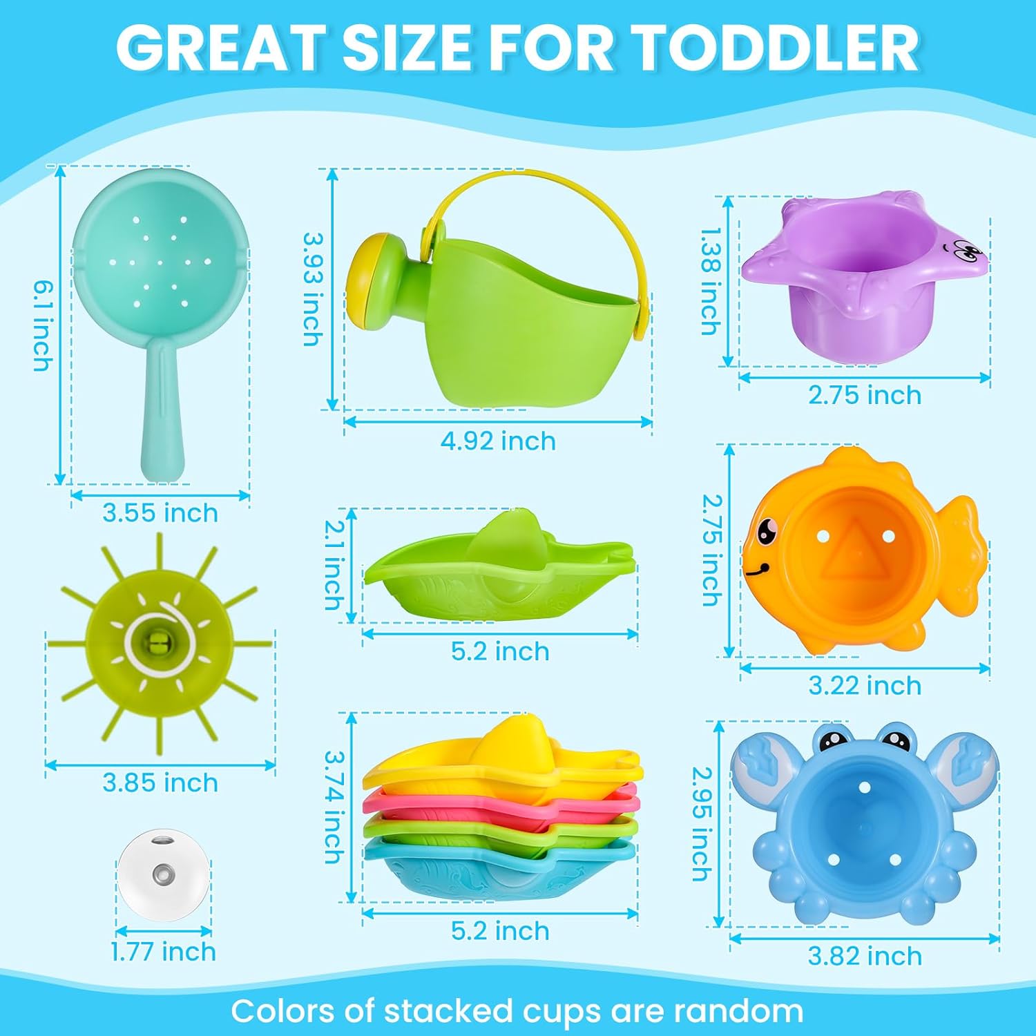 【Bath stacking and sorting】 The stacking cups are both sturdy and flexible, the play boats float well and the components offer a number of different ways to explore and play with them, from stacking and sorting to watching the water flow over or out of each component, they are brightly coloured and designed to drain quickly and well without creating an abyss for the water to create mould.