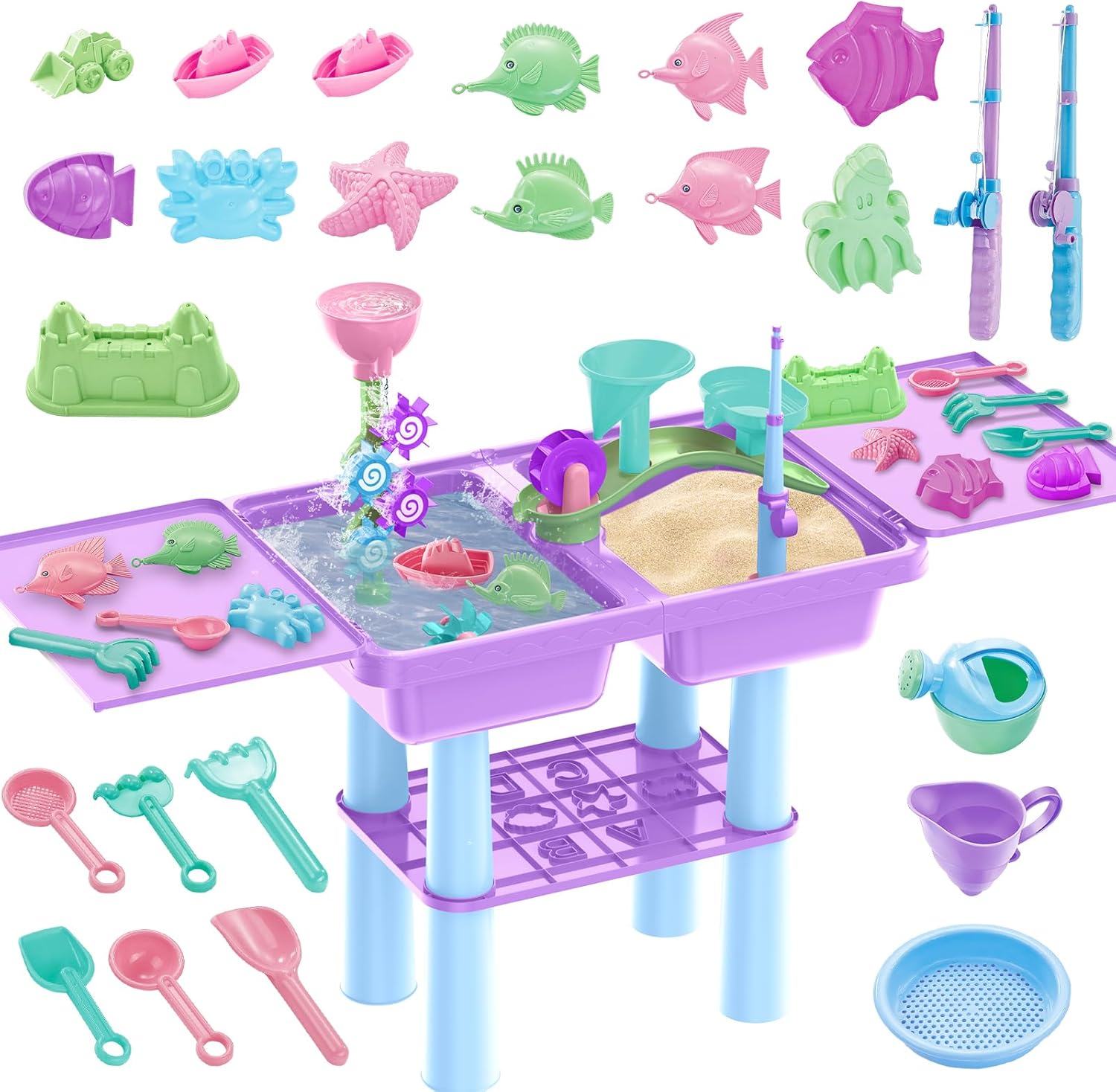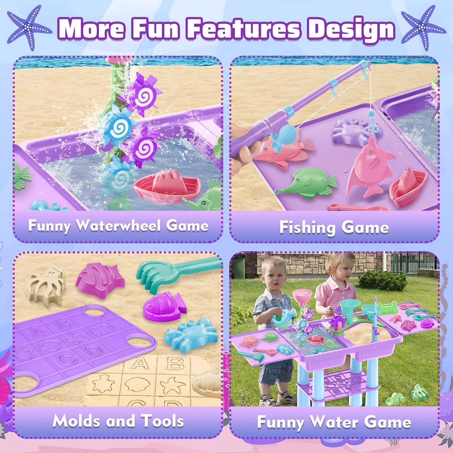 deAO Sand and Water Table for Toddlers, Outdoor Play Table Summer Toys with 23PCS Beach Toys, 2 Fishing Pool Toys, Sand Pit Water Table Children Garden Toys Activity Sensory Table for Kids (Purple)