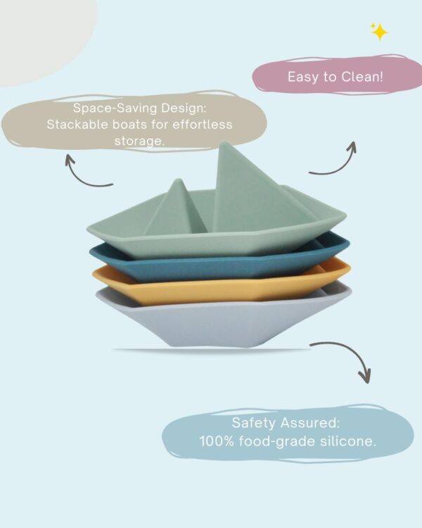 Easily cleaned and stackable, our silicone boats simplify bath time and save space.