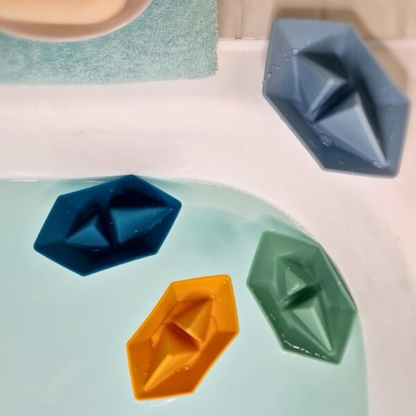 Float & Play Bath Toys: Set sail on imaginative adventures with 4 colorful, floating silicone boats in green, grey, blue, and yellow.