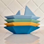 Set sail on imaginative adventures with 4 colorful, floating silicone boats in green, grey, blue, and yellow.