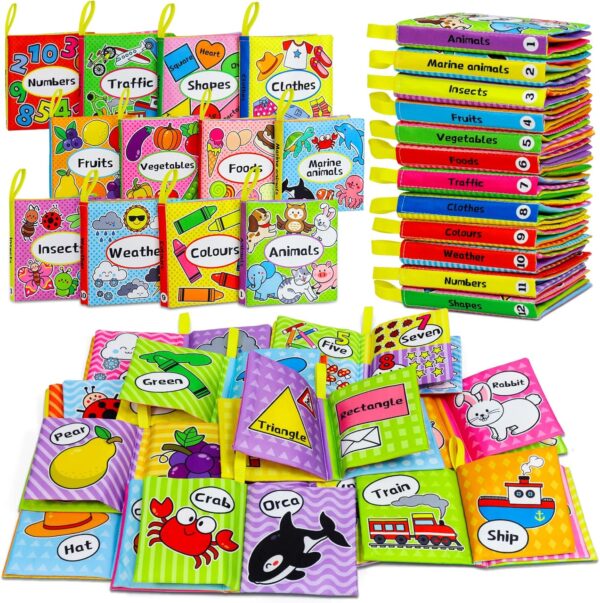 12 Themes in One Set : Different interesting themes help your baby start to learn things about this wonderful world. This soft book set gets all you need! It contains 12 different themes cloth books, animals, marine animals, insects, fruits, vegetables, foods, traffic, clothes, colors, weather, numbers and shapes.