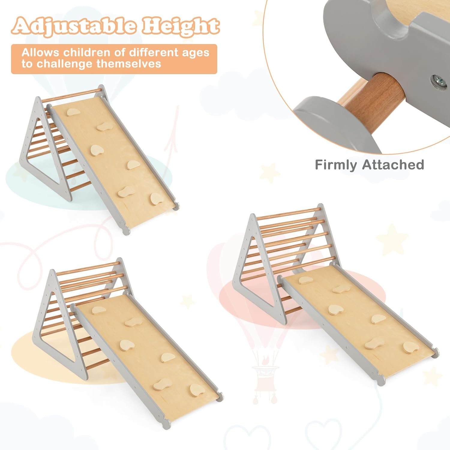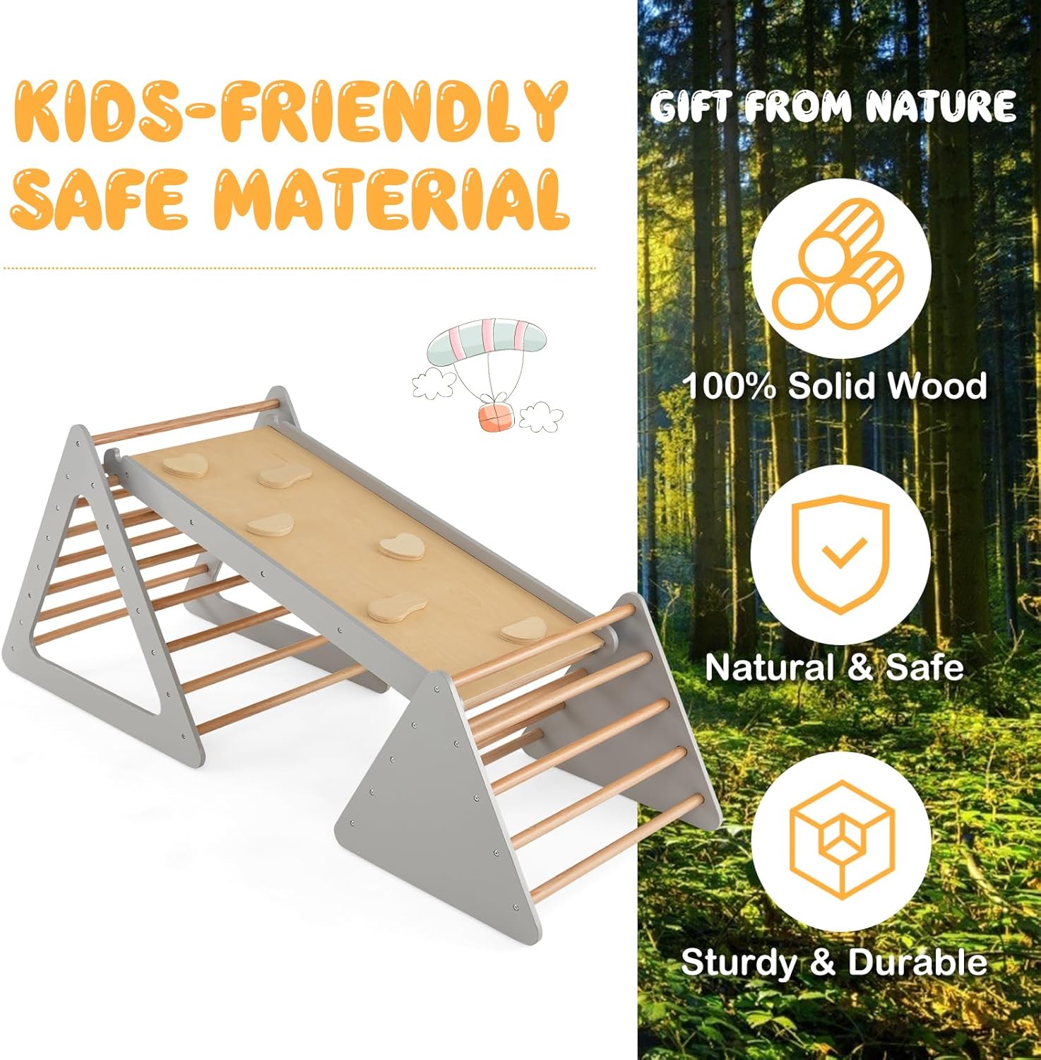 GYMAX 3 in 1 Kids Climbing Set, Wooden Toddler Climber with Reversible Ramp, Outdoor Indoor Children Climbing Frame for 3 Years Old + Boys Girls (Natural+Grey)