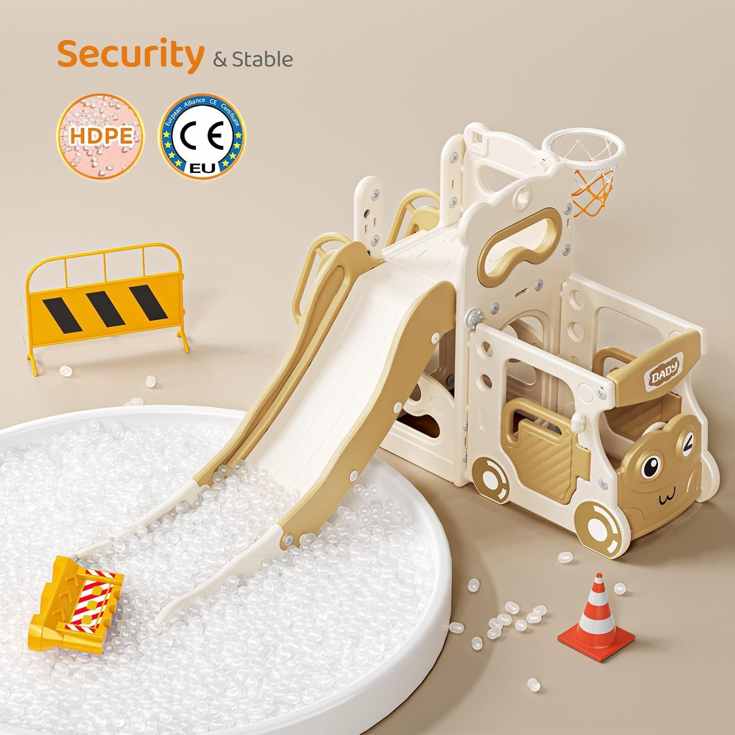 Kids Slide,4 in 1 Indoor Kids Slide,with Basketball Hoop, Basketball,Car head storage,1950mm Extra Long Slide,for Ages 18-36 Months(Beige-Brown)
