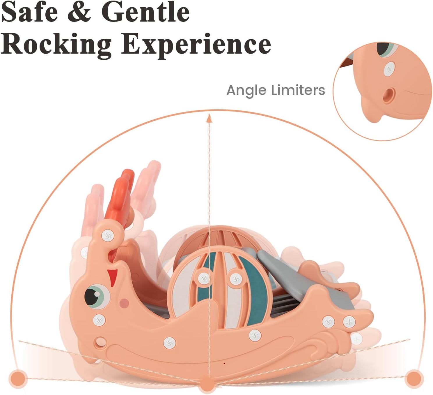 Safe Rocking & Sliding: The kids rocking horse has the angle limiter and easy-to-grip handrail, which allow child to rock back and forth safely. Meanwhile, The toddler slide mode features buffer stop zone for smooth sliding.
