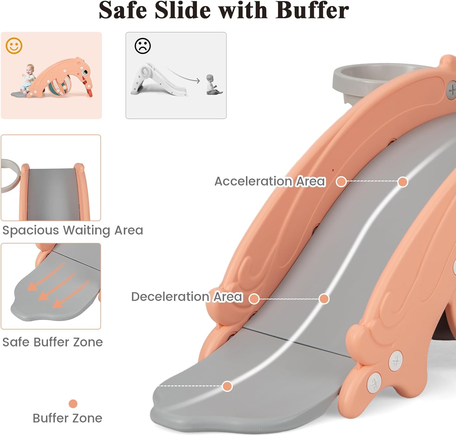 Considerate Designs: Spacious seat can provide comfortable sitting experience and 2-step climbing ladder is easy for child to climb to the slider. Besides, smooth and burr-free smooth can protect kids’ delicate skin well.