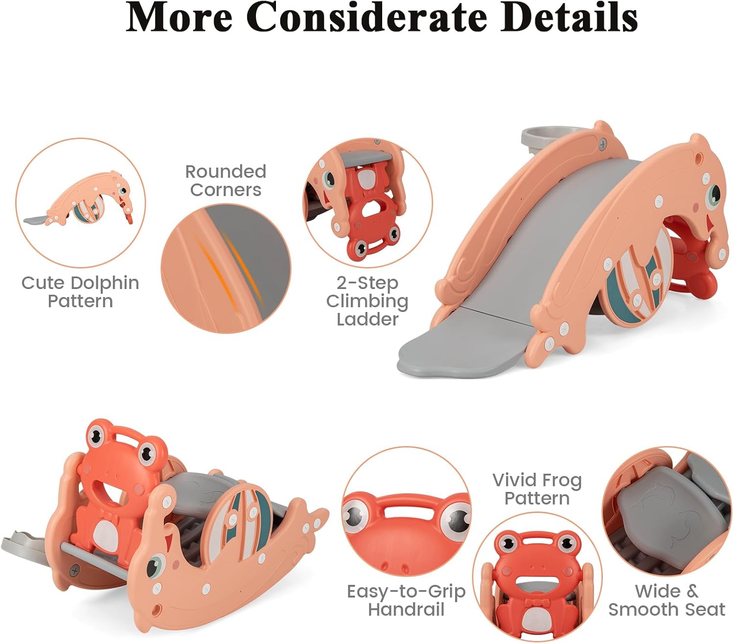3-in-1 Activity Center: This innovative toy provides 3 fun game modes for your little one to enjoy sliding, rocking and shooting basketball. Besides, vivid frog appearance and cute dolphin pattern can attract kids’ attention well.
