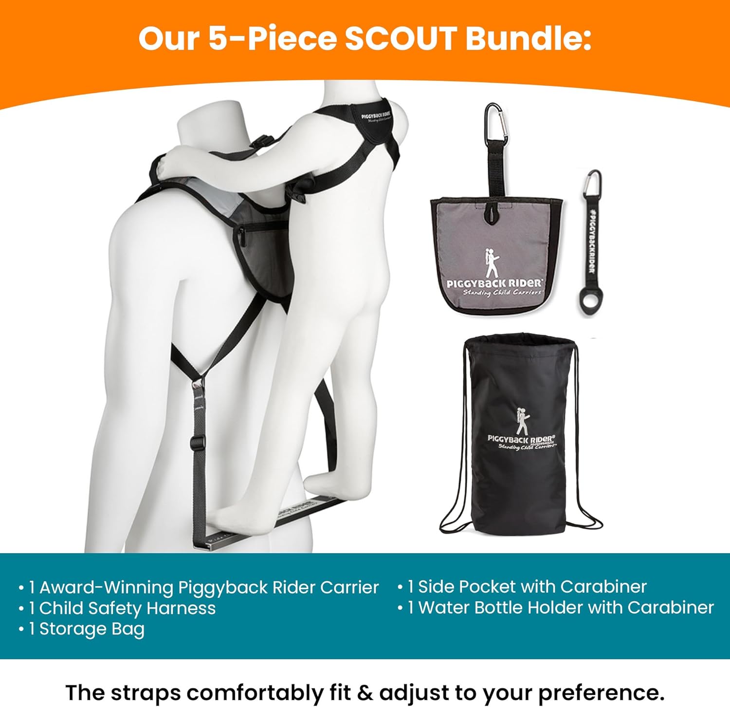 5 Piece Bundle includes: (1) Award winning adult Piggyback Rider carrier, (1) Child size safety harness, (1) Storage bag accessory, (1) Side pocket attachment accessory, (1) Water bottle holder with carabiner accessory.