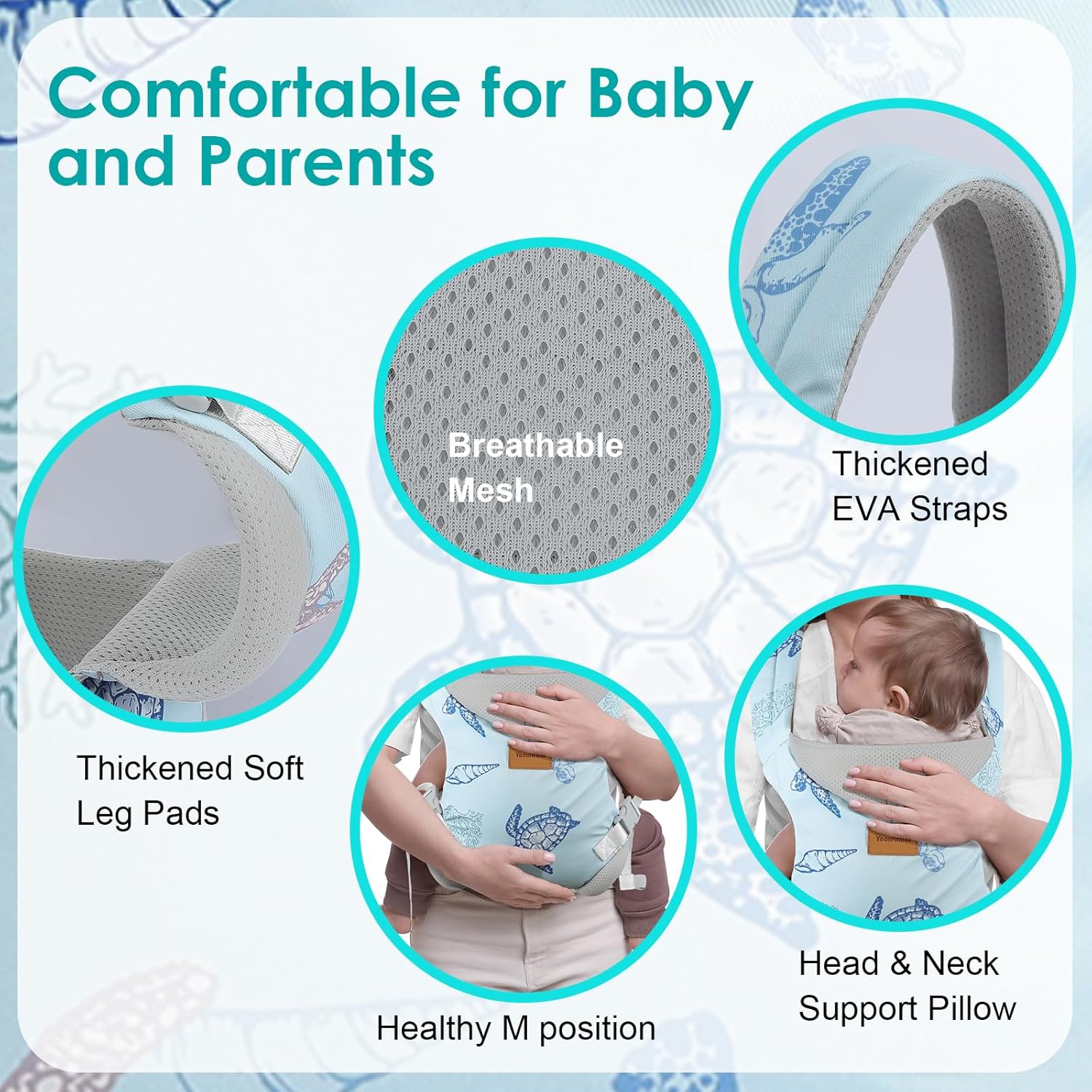 Ergonomics: The baby carrier features an adjustable ergonomic seat, wider and thicker shoulder straps and waistbelt, which evenly distributes the weight to the wearers waist, tummy and shoulders for a more comfortable fit