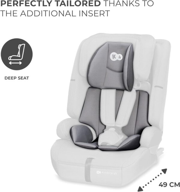 MODULAR INSERT: The car seat is equipped with a soft and comfortable insert for younger children, which is modular and you can easily adjust it to your little one; You can use the insert for a child up to 87 cm tall (the part under the buttocks) or up to 105 cm (headrest)