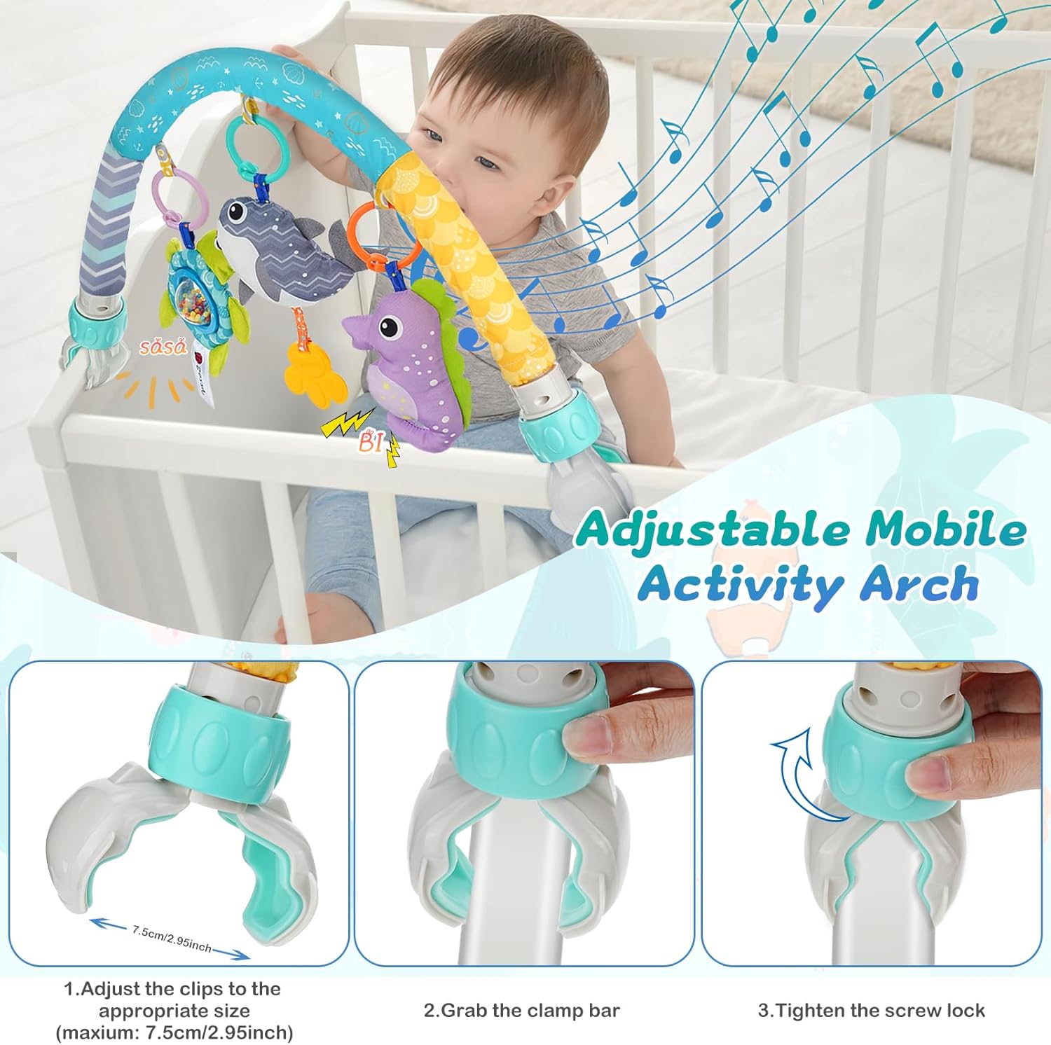 【Safety Material】Clip on baby mobile arch made of high-quality pp material and 100% safe fabric cotton, non-toxic and BPA-free, tough and durable, so there is no need to worry about the safety of children. Design with no sharp edges that allows children to play safely. Your baby will fall in love with it.
