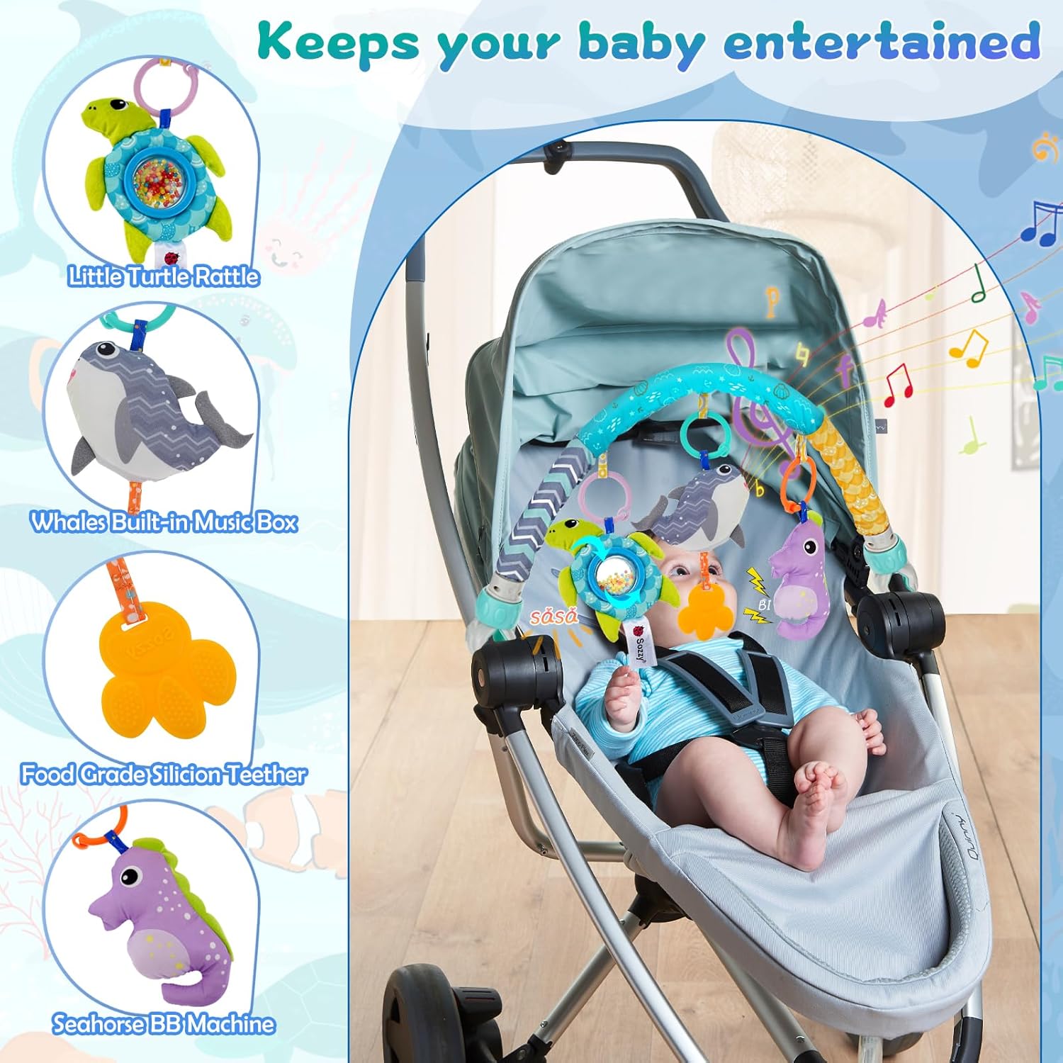 【Soothes Emotions】Musical sensory toys comes with 3 removable animal pendants, little turtle designed with ball rattles, whales with a built-in music box, seahorse with a built-in bb machine, when the kid reaches out his little hand to try to squeeze the doll, the sound from small hanging animals can attract their attention and soothe the irritability and anxiety of them when crying.