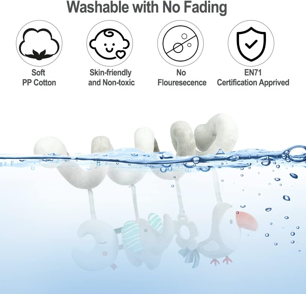 Multi-function – It can be spiral hung on the stroller as a car hanging toy, or it can be hung beside the crib. It can be used in multiple scenes, and the animal doll can accompany the baby anywhere