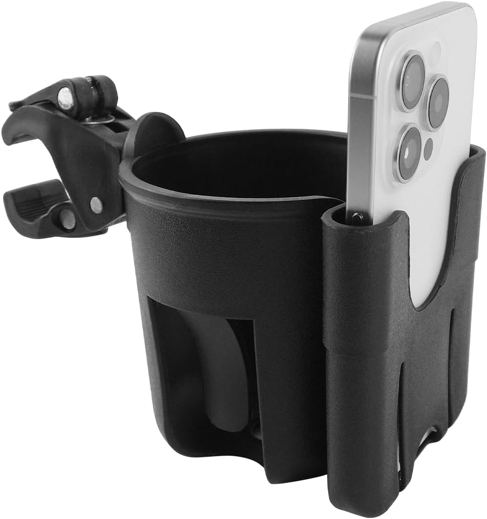 Cup Holder with Phone Holder: Our stroller cup holder also comes with a removable cell phone holder, the 2-in-1 design stroller cup holder holds most types of cups and cell phones at the same time, a necessity for stroller accessories.