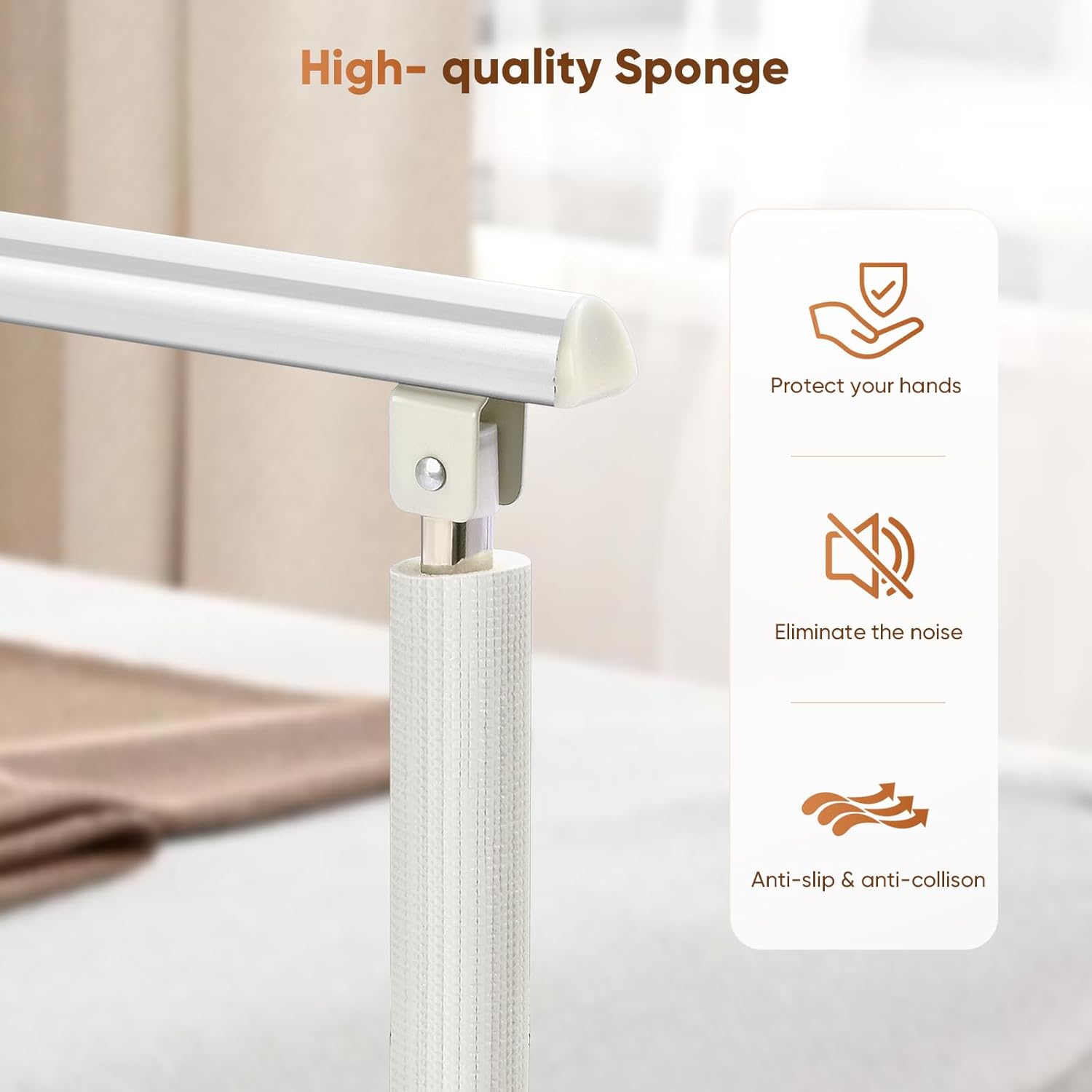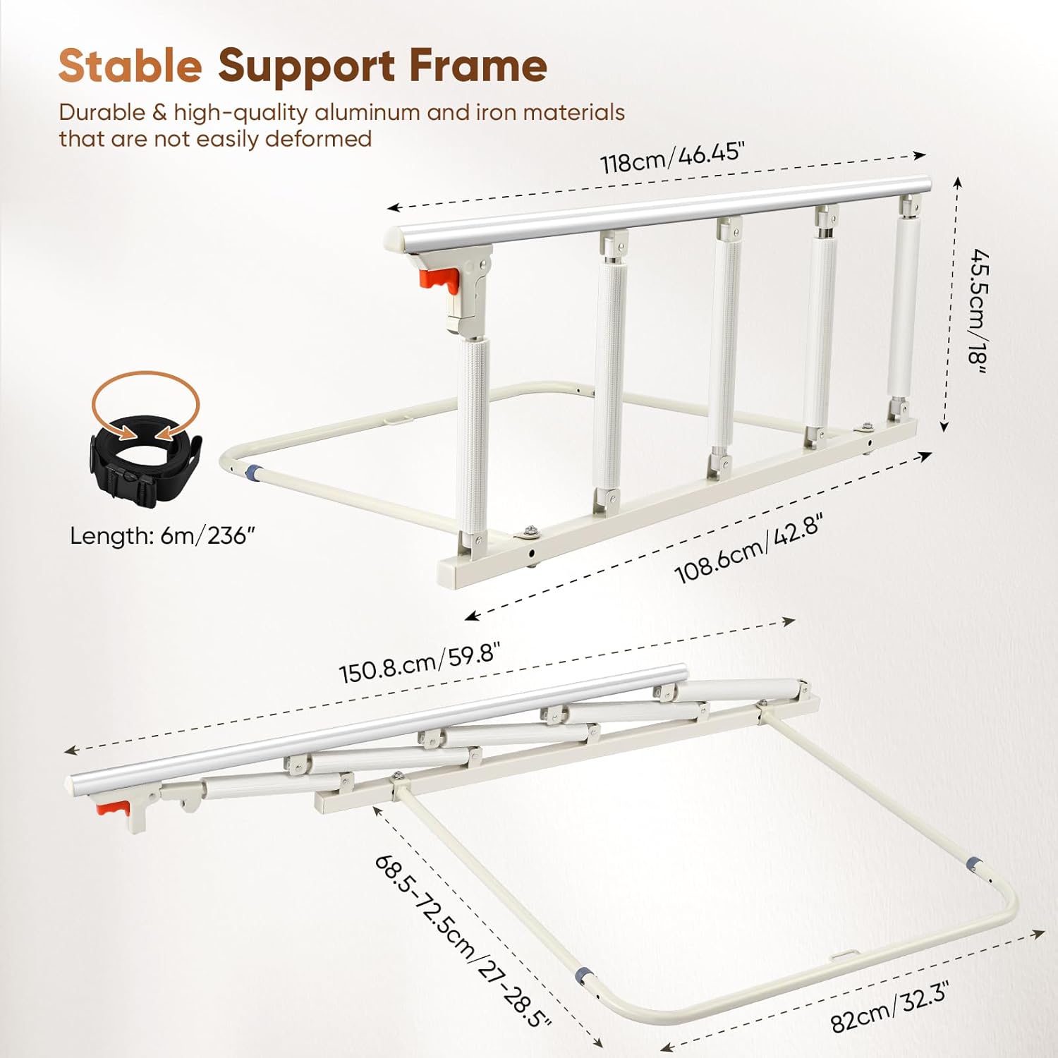 Enhanced Safety Features:The vertical bars of our bed guard rail are equipped with sponge paddings to protect your hands and provide a secure grip, giving you an added peace of mind while you get in and out of bed. Its package includes a 6m long strap for a stable and secure fit.