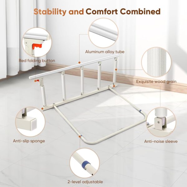Easy to Install and Fold:The bed side rail has complete accessories for quick and hassle-free installation in 5 minutes. Plus, there is a red folding button that allows you to raise and lower the rail freely. And the metal connectors with plastic sleeves can eliminate noise so the operation will not disturb others.