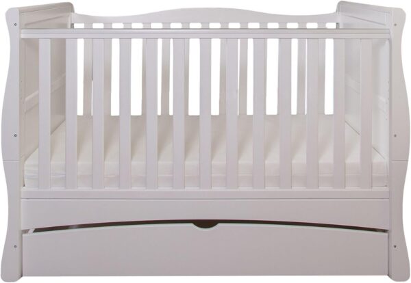 Viculii GILBERT Baby Sleigh Cot Bed with Drawer and Mattress 140x70x10cm | 3 in 1 Large White Cot Bed Converts to Toddler Bed Junior Bed