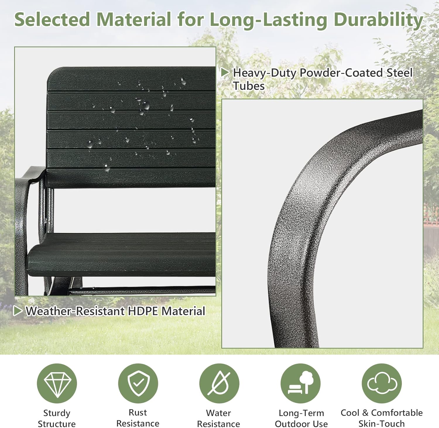 【Easy Assembly and Maintenance】Comes with all the hardware and necessary tools, this outdoor gliding loveseat is easy to assemble, following the instructions and you can assemble it quickly and easily. Moreover, the steel frame and HDPE seat are easy to clean, just simply wipe it down.