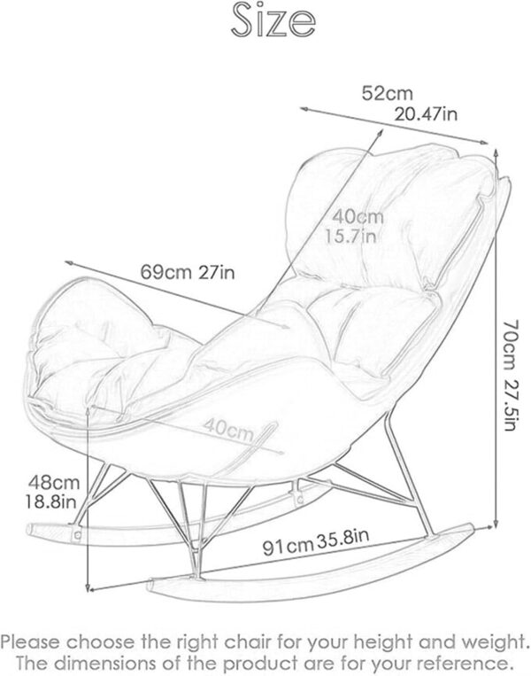 Specifications: Name: Modern Upholstered Glider Chair Material: tech cloth + Steel tubes + PP Cotton + Sponge Size:55 x 75 x 82 /21.65 x 29.5 x 32.2Inch Product Application: Home Decoration / Restaurant / Office / Model House, Etc. Package Includes: 1 x Rocking Chair Tip: We only sell Recliners chair, not including other decorations. Due to problems with light, display, etc. the color difference of the product is normal. You don’t have to worry about any after-sales problems. We believe that your satisfied smile is our motivation and we will try our best to meet your needs. If you have any questions about the product, please leave us a message and we will get back to you within 24 hours.tact us in time.