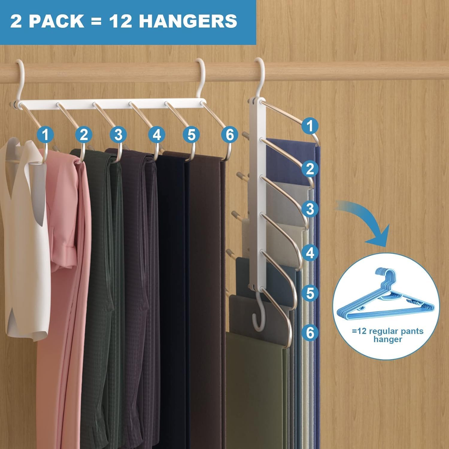 6 Layered Hanger: Compared with traditional pants hanger, these 6 tier trousers hangers convey 2 ways of use, each hanger at least holds up to 6 jeans, trousers,leggings,scarves or other clothing. Keeping your items organized and saves a ton of space in small closets with a lot of clothes.
