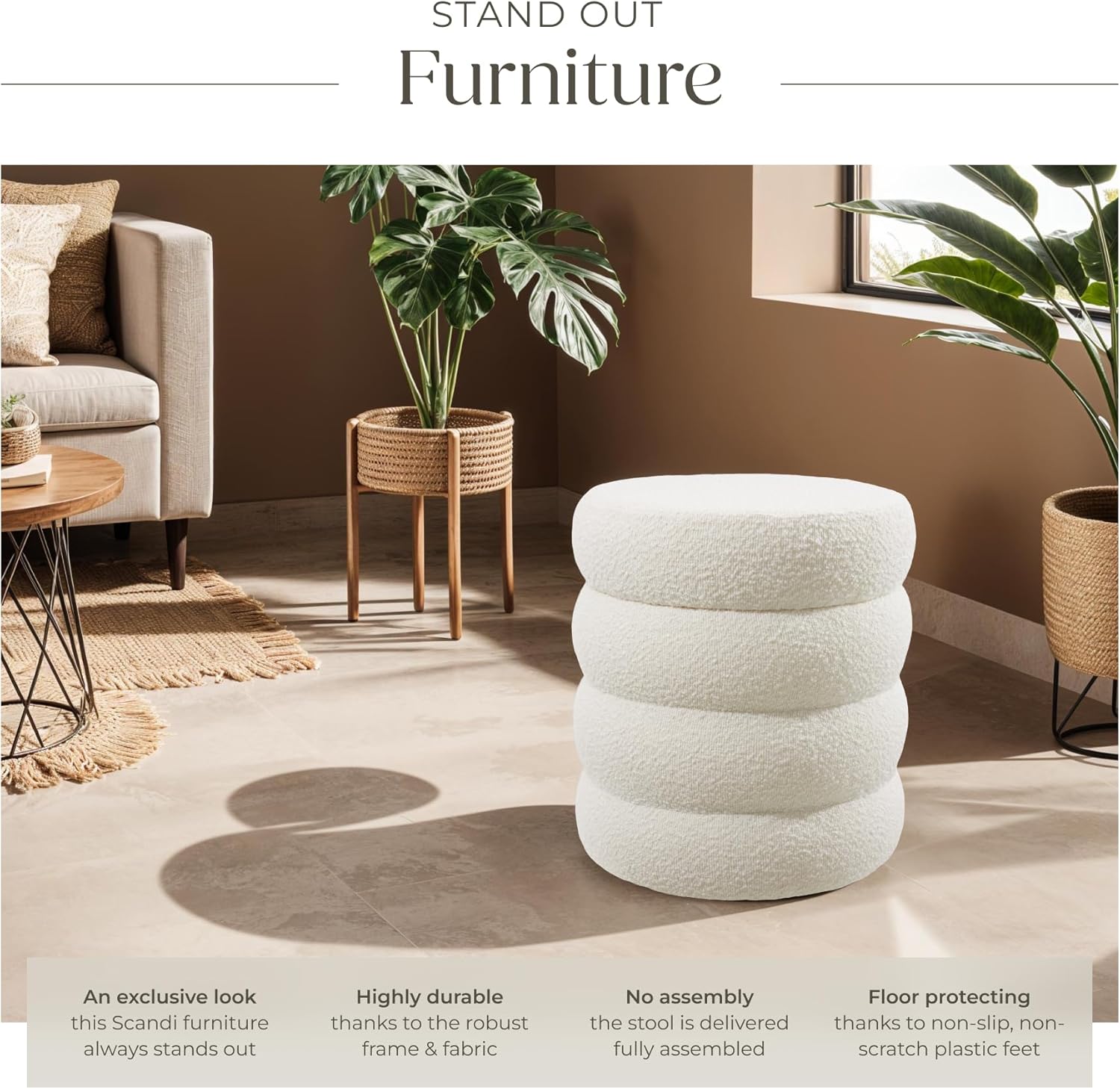 COSY & VERSATILE DESIGN: Transform your space with our elegant bouclé ottoman, designed in a homely Scandinavian style. The plush bouclé fabric exudes a cosy charm, making this ottoman stool perfect as a beautiful vanity chair for your bedroom decor. The versatile design allows this round stool to serve as a pouffe footstool, a practical storage seat, or a side table. Keep your living area clutter-free by storing blankets, pillows, and other essentials inside this cosy storage footstool.
