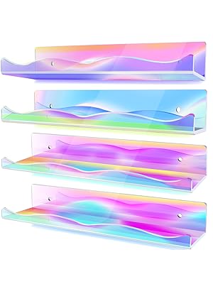 LINYAPRY 4 Packs Iridescent Acrylic Floating Shelves, 15.7 Inch Clear Acrylic Display Shelf Wall Mounted, Invisible Dolls Pop Display Shelves Wall Ledge Bookshelf for Kids Room Bathroom Dorm