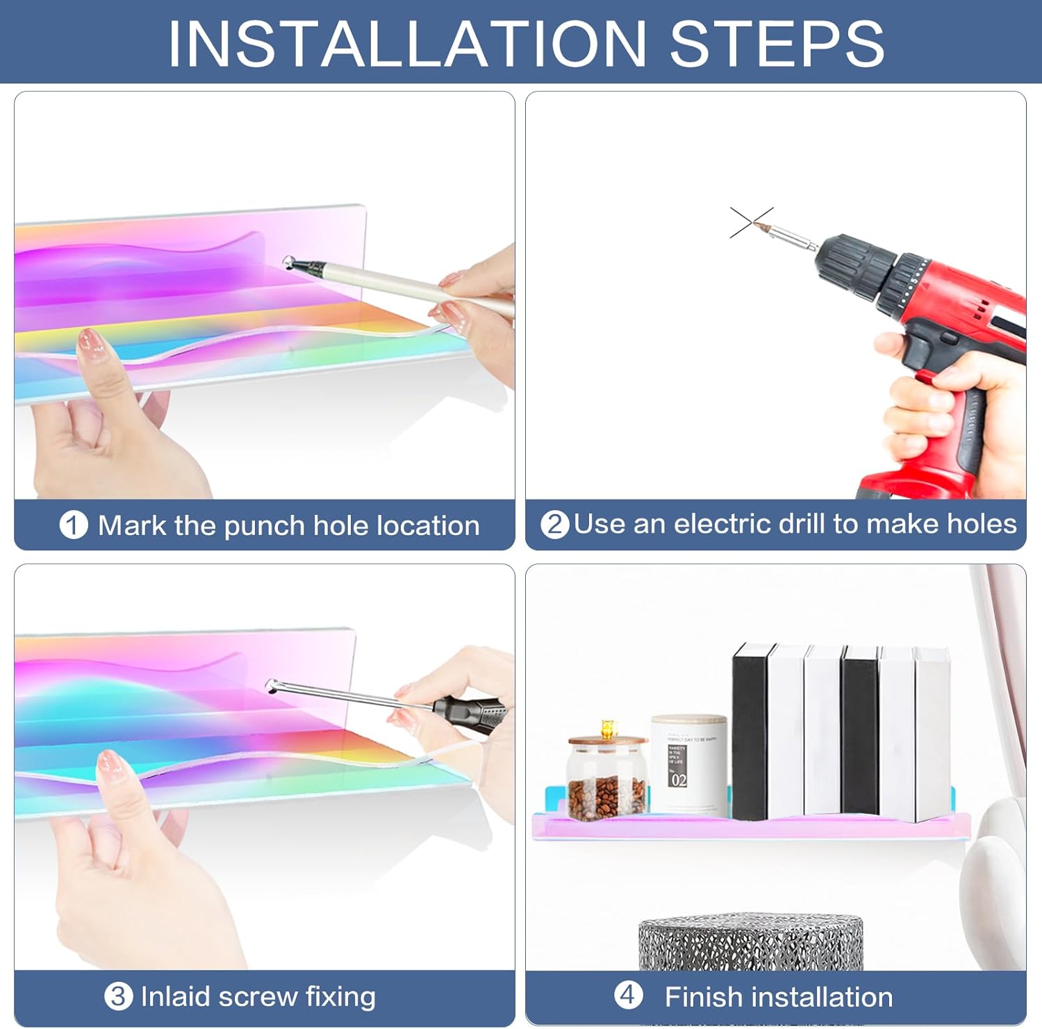 LINYAPRY 4 Packs Iridescent Acrylic Floating Shelves, 15.7 Inch Clear Acrylic Display Shelf Wall Mounted, Invisible Dolls Pop Display Shelves Wall Ledge Bookshelf for Kids Room Bathroom Dorm