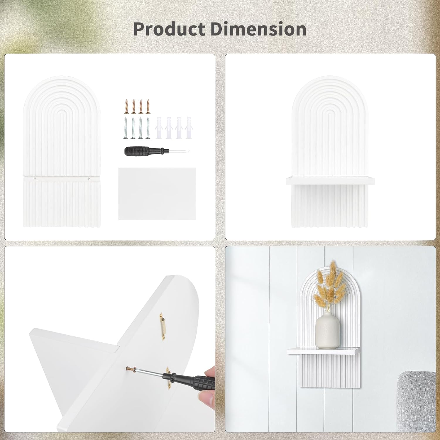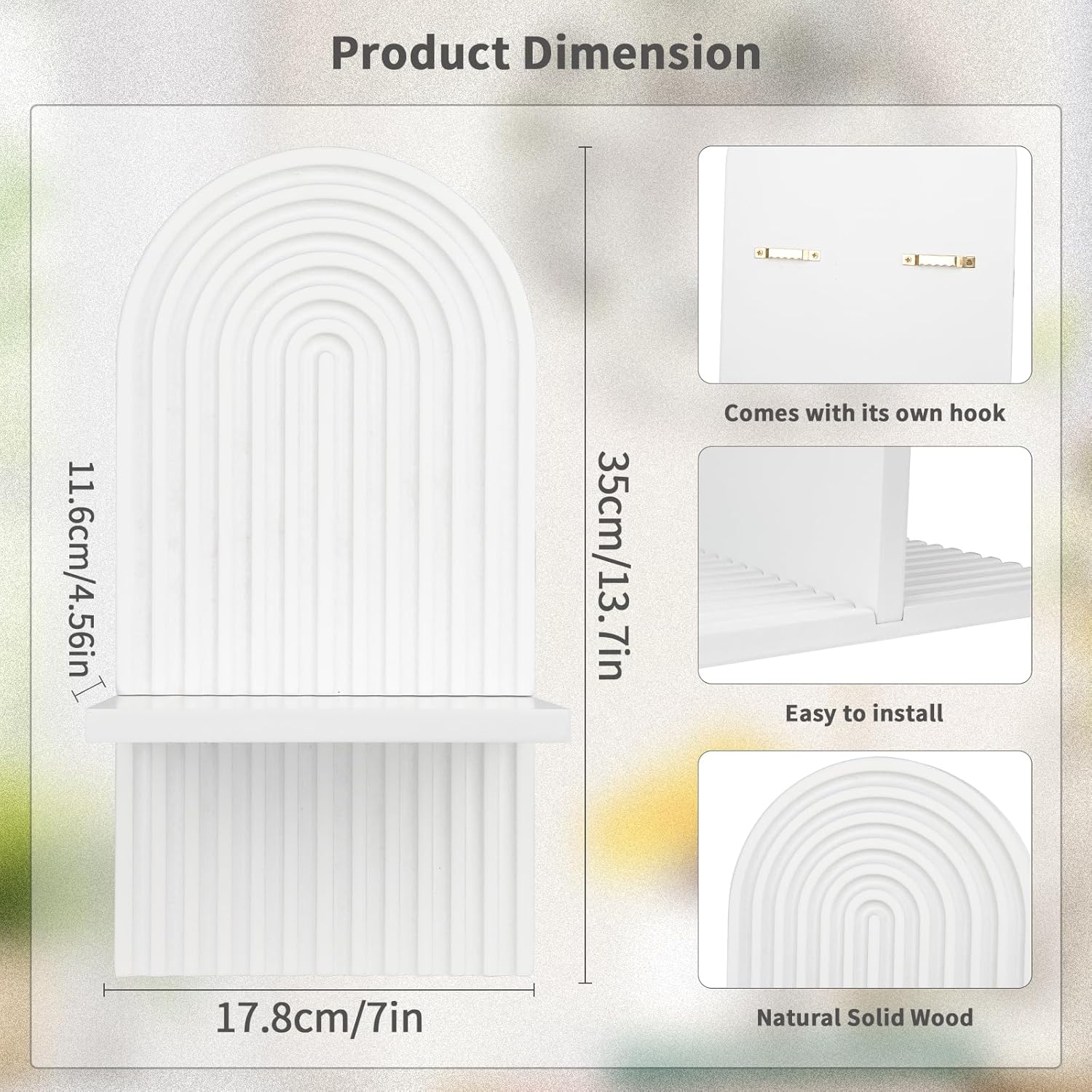 Easy to install: The wall mount arch wall shelf has a triangular hook on the back, allowing you to hang it directly. At the same time, there are installation holes on the surface of the wooden board, and we provide you with matching screws. You can use our screws to connect the wall bracket with the horizontal wooden board, increasing the stability of the wooden frame.