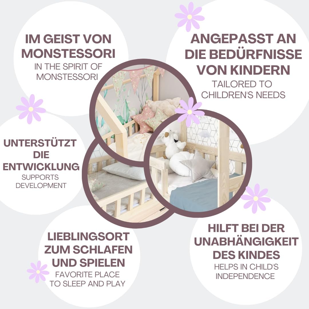 The single bed for kids with wooden bed frame provides a child with a sense of security and protects them from accidental falls during sleep. Parents can sleep peacefully, knowing that their child is safe in this child bed base. The guardrails can be removed.