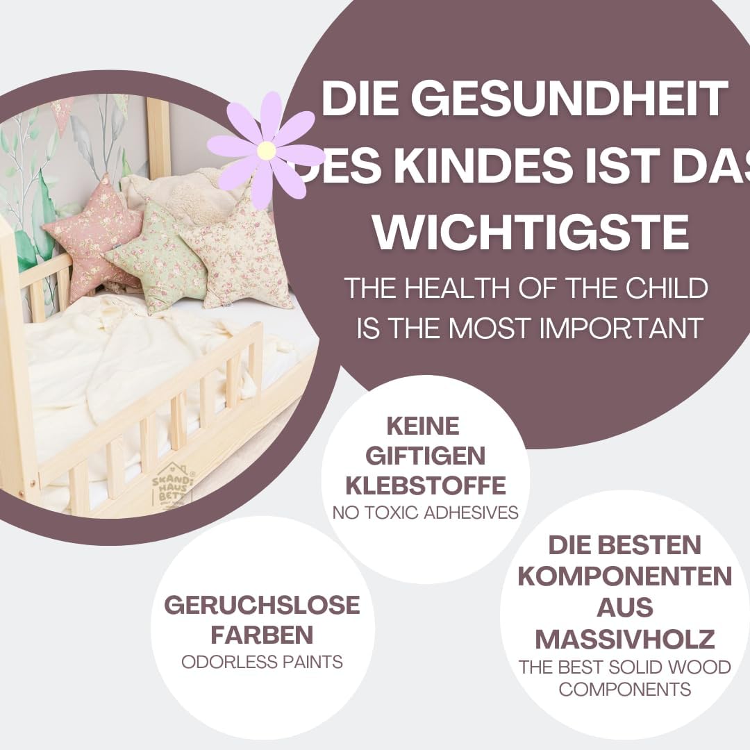 Our house bed was constructed from A/A quality solid wood. The manufacturer’s many-year experience in woodworking and in production for children made it possible to devote a lot of attention to the elements of the beds. Each piece is hand sanded and rounded, ensuring the safety of toddlers and older children.