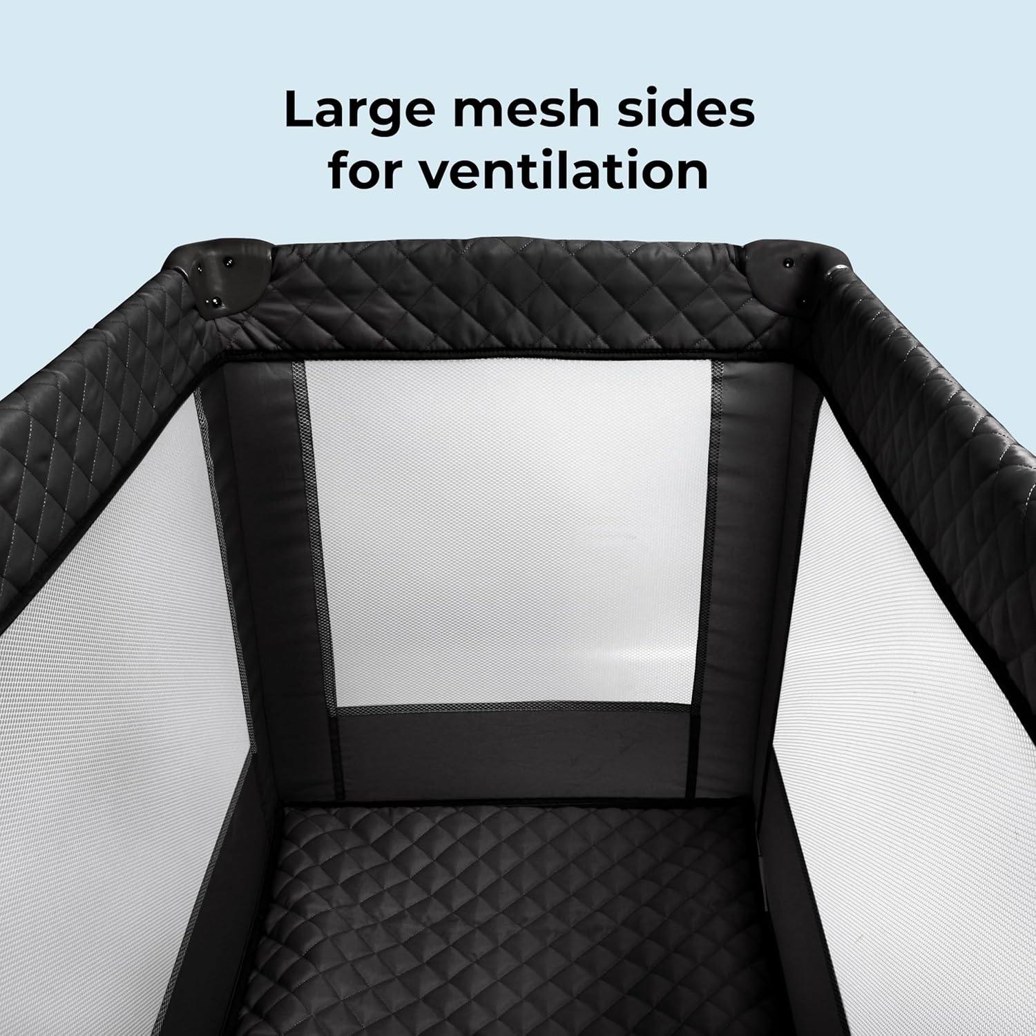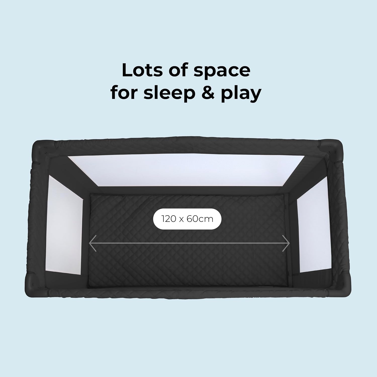 Comfy padded mattress base included Stylish quilted black fabrics Perfect for holidays and overnight stays Also makes a great play pen