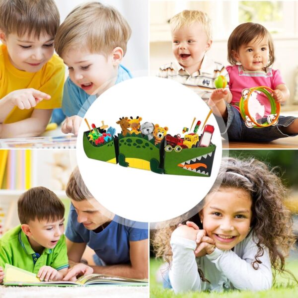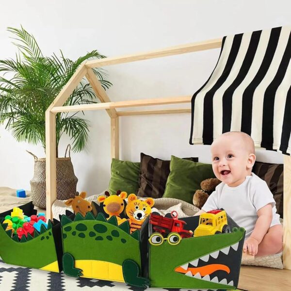 2. Our s Crocodile Pattern Felt Bins cartoon crocodile pattern is ideal for kids. It can organize and store toys of all sizes and has three separate components that are joined by a strap.