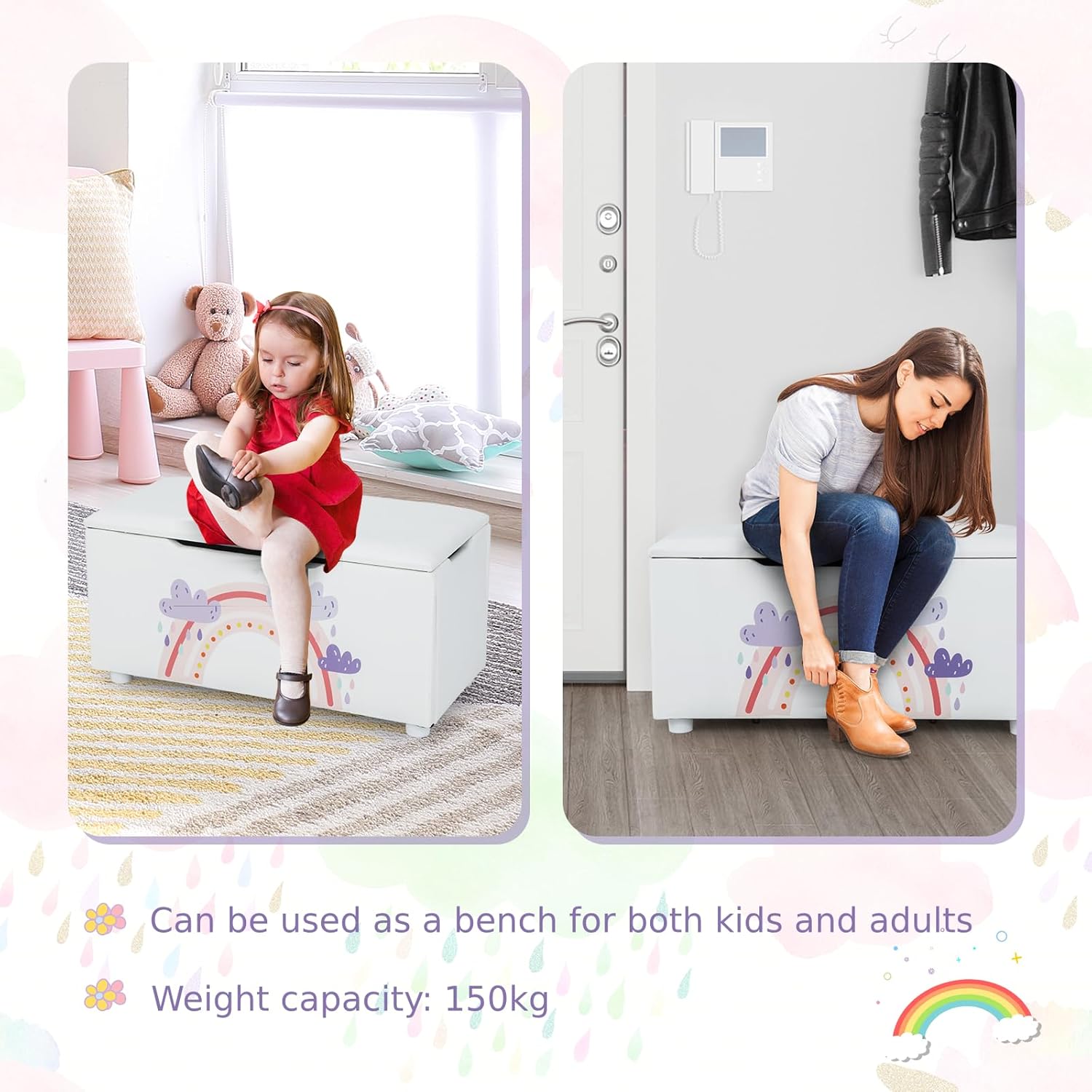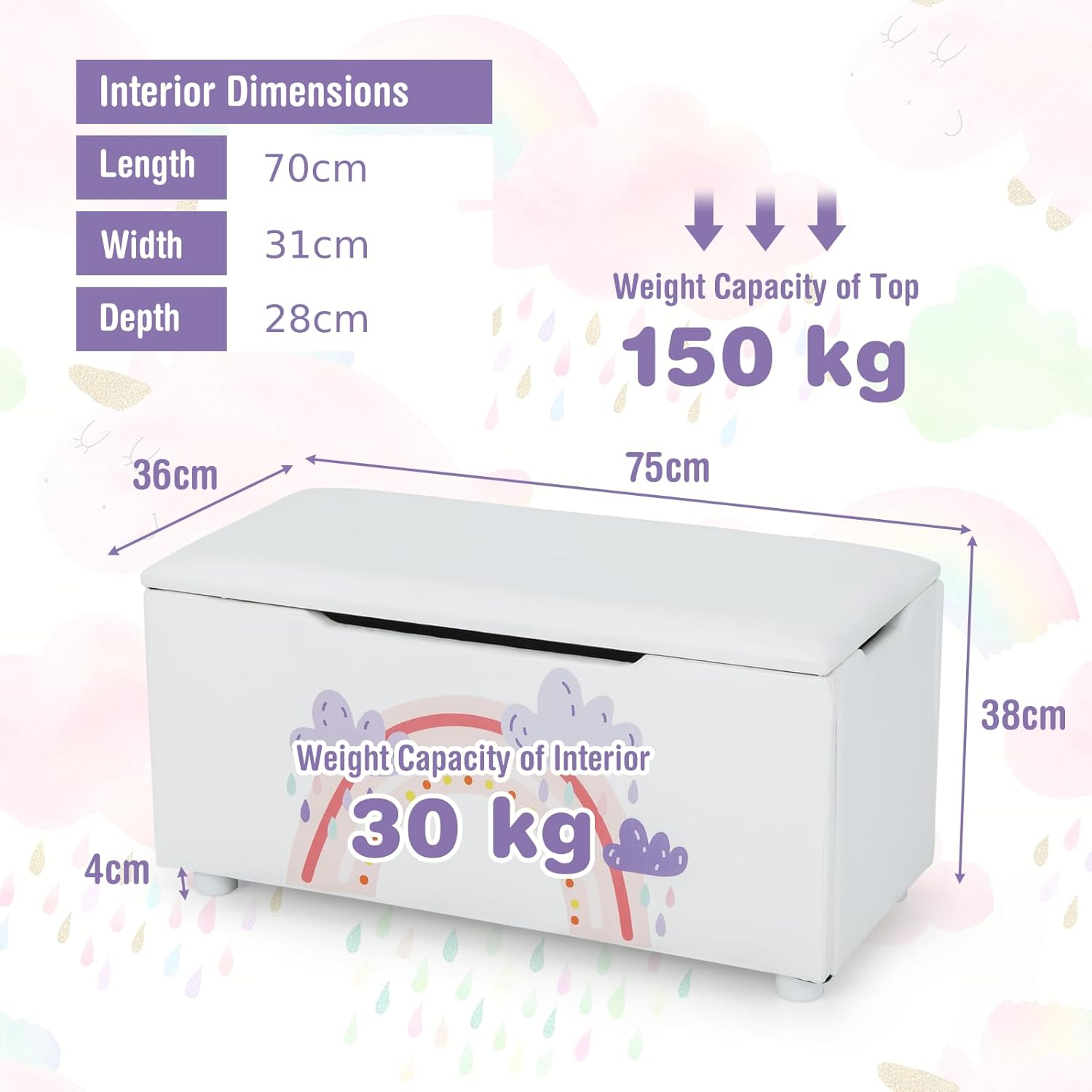 Smooth edges to ensure the safety of kidsEasy assembly and smooth surface for easy cleaningGood load capacity of 150 kg on top and 30 kg insideThe built-in straps enable kids to pull the toy box anywhereSuitable for children’s rooms, living rooms, hallways, bedrooms, etc.