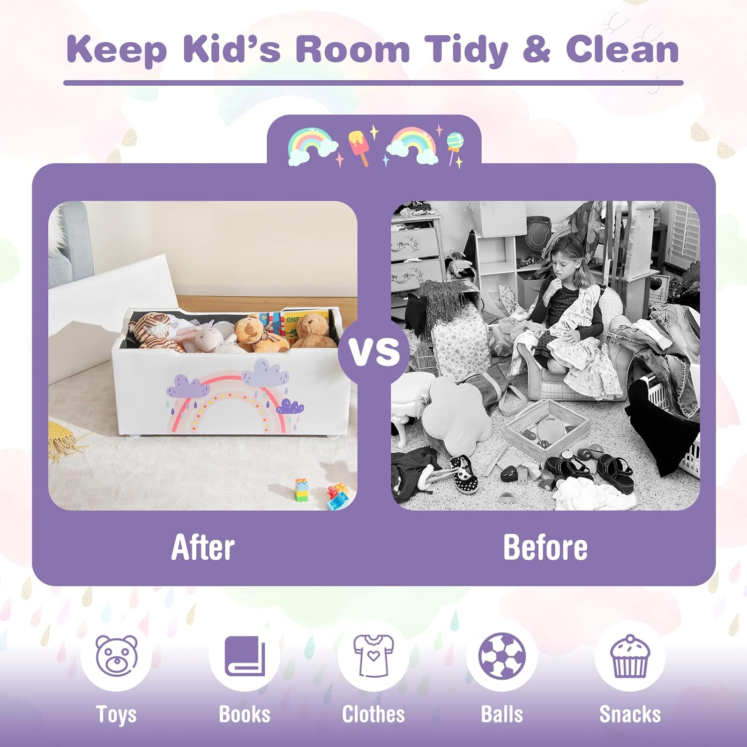 ✔WIDELY USE & HUMANIZED DETAILS- This large toy box has a adorable rocket & planet/ rainbow & cloud pattern, which is very appealing to children. Our kids storage box is suitable for kids’ room, living room, hallways, etc. Besides, the smooth surface, curved edges and side grooves of this toy storage organizer will prevent your child from getting hurt.