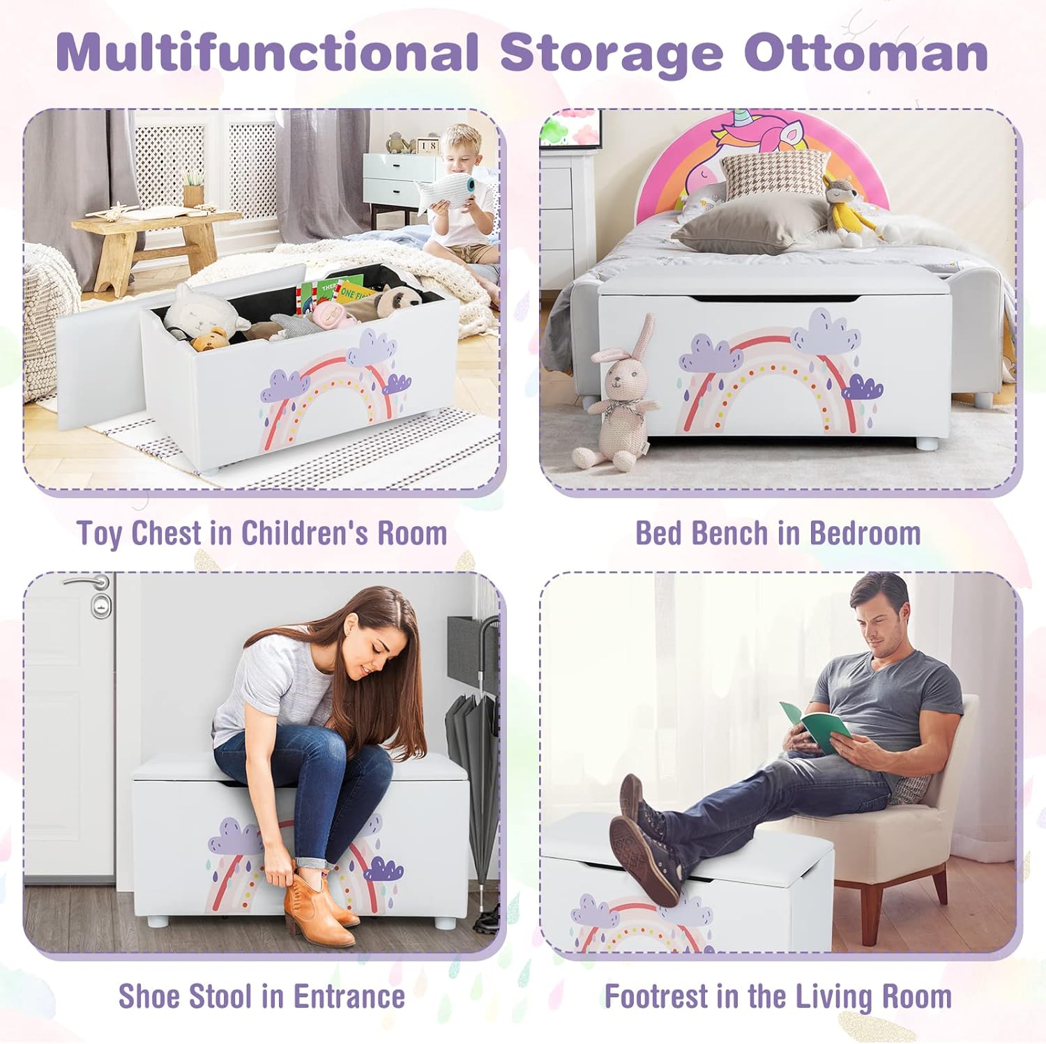 Closing the lid, the normal toy storage box can be used as a bench seat.Large storage space can be stored children’s toys, clothes, books and more.Adorable rocket & planet/ rainbow & cloud pattern immediately attracts children’s attention. Feature: