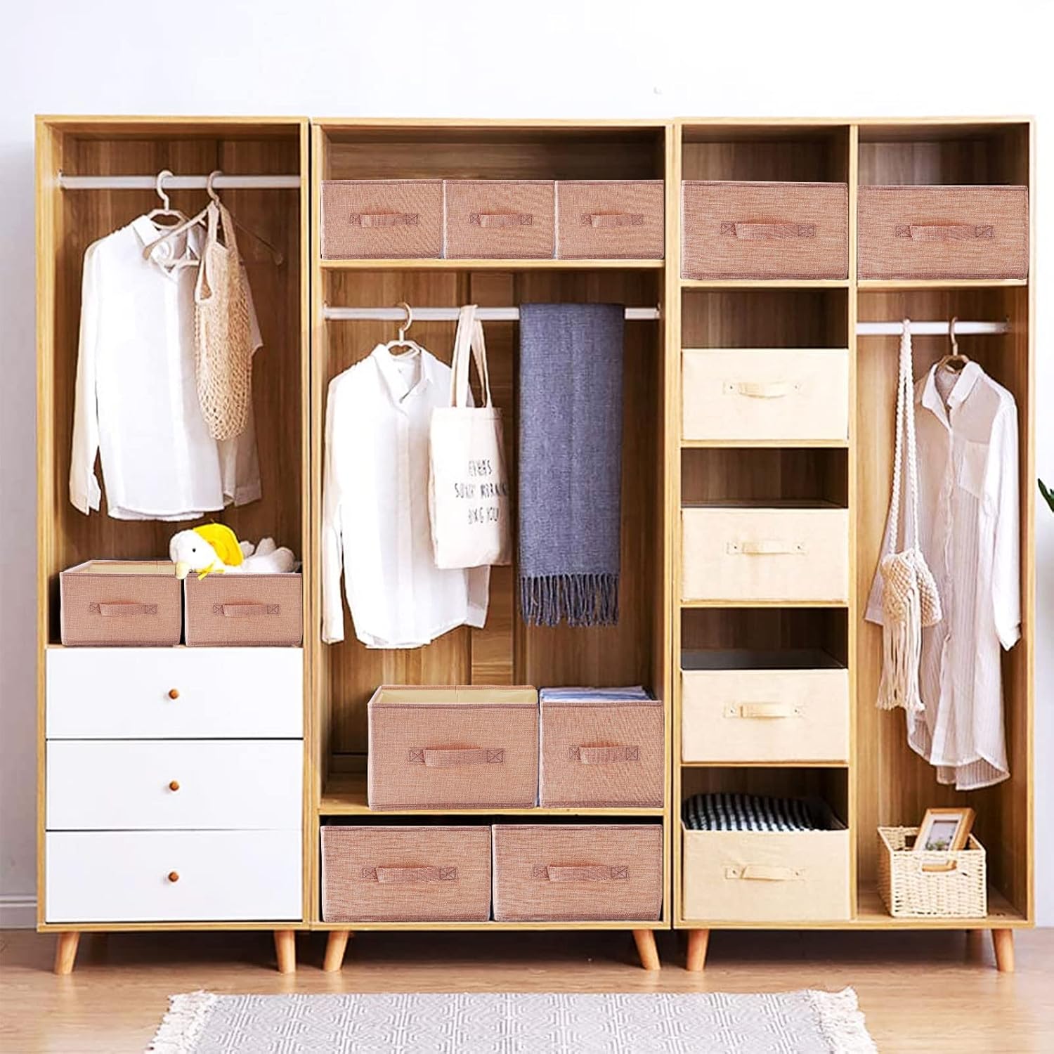 Foldable Wardrobe Boxes: The clothes organiser can be folded and has a hard bottom plate, which can stabilize the wardrobe dividers well. The bottom plate can be taken out when not in use, and then folded for storage