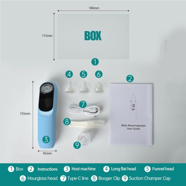 Rechargeable design : Baby Nose Aspirator is Rechargeable design, provides over 120 minutes of usage after a full charge. Its compact size, along with the included storage box, Silicone Tip * 3, Booger clip * 1, Charge cable * 1, Manual * 1, you to pack the aspirator and tips at any time or take it out on any travels