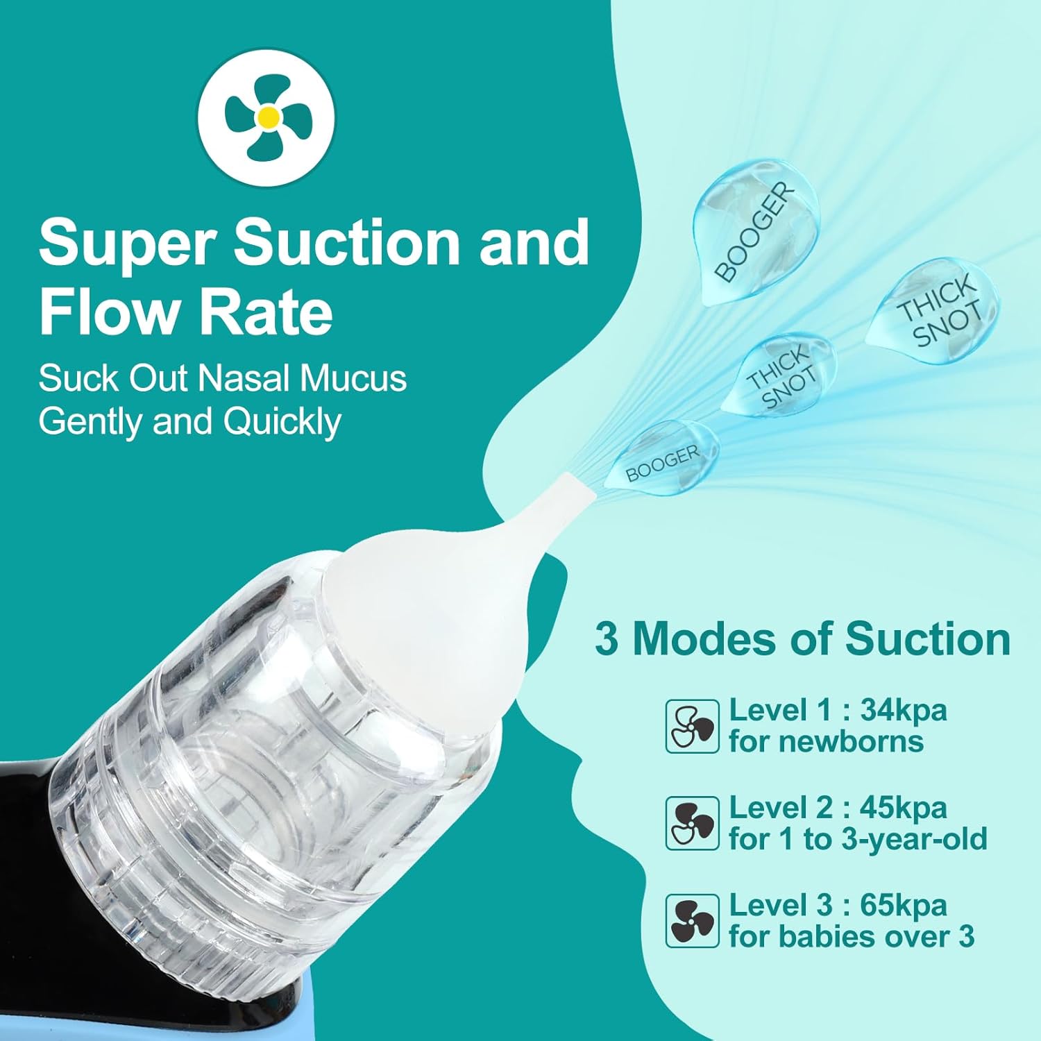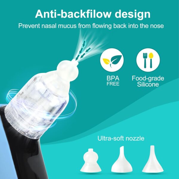 COMFORT Materials : Electric Nose Suction for Baby are designed with infants in mind, ensuring a safe and gentle application. Made of entirely odorless and non-toxic natural materials, suction chamber with Anti-back feature, This design ensures that secretions within the mucus are completely contained. 3 food-grade silicone tips, and the soft and flexible material ensures it is gentle on your baby’s sensitive inner nasal surface